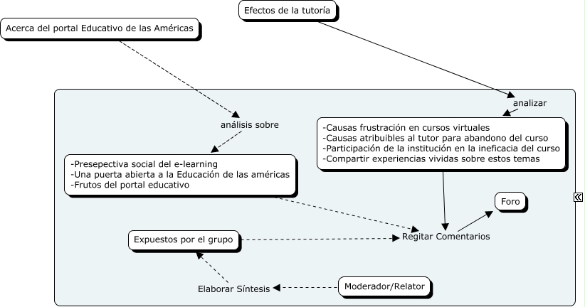 Este Cmap, tiene información relacionada con: PD - Articulos web 1, Acerca del portal Educativo de las Américas ???? Procesamiento pedagógico, Expuestos por el grupo Regitar Comentarios Foro, Moderador/Relator Elaborar Síntesis Expuestos por el grupo, Efectos de la tutoría analizar -Causas frustración en cursos virtuales -Causas atribuibles al tutor para abandono del curso -Participación de la institución en la ineficacia del curso -Compartir experiencias vividas sobre estos temas, -Presepectiva social del e-learning -Una puerta abierta a la Educación de las américas -Frutos del portal educativo Regitar Comentarios Foro, -Causas frustración en cursos virtuales -Causas atribuibles al tutor para abandono del curso -Participación de la institución en la ineficacia del curso -Compartir experiencias vividas sobre estos temas Regitar Comentarios Foro, Acerca del portal Educativo de las Américas análisis sobre -Presepectiva social del e-learning -Una puerta abierta a la Educación de las américas -Frutos del portal educativo