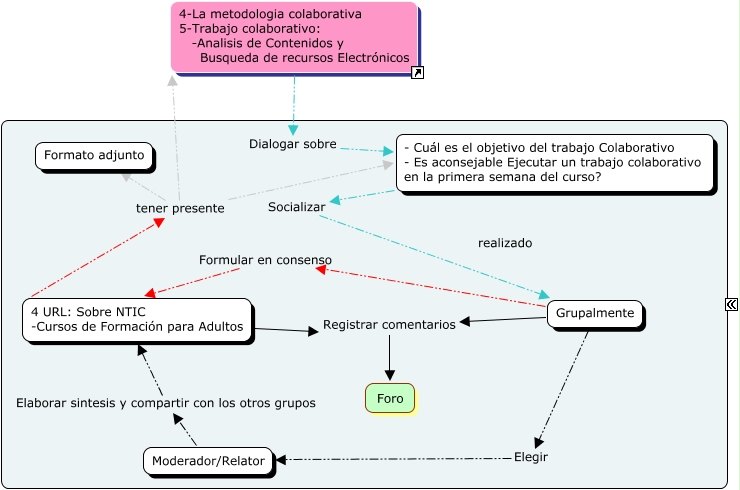 Este Cmap, tiene información relacionada con: PD - Tema 4-5, Grupalmente Registrar comentarios Foro, 4-La metodologia colaborativa 5-Trabajo colaborativo: -Analisis de Contenidos y Busqueda de recursos Electrónicos Dialogar sobre - Cuál es el objetivo del trabajo Colaborativo - Es aconsejable Ejecutar un trabajo colaborativo en la primera semana del curso?, - Cuál es el objetivo del trabajo Colaborativo - Es aconsejable Ejecutar un trabajo colaborativo en la primera semana del curso? Socializar Grupalmente, Moderador/Relator Elaborar sintesis y compartir con los otros grupos 4 URL: Sobre NTIC -Cursos de Formación para Adultos, 4 URL: Sobre NTIC -Cursos de Formación para Adultos tener presente Formato adjunto, 4 URL: Sobre NTIC -Cursos de Formación para Adultos tener presente 4-La metodologia colaborativa 5-Trabajo colaborativo: -Analisis de Contenidos y Busqueda de recursos Electrónicos, 4 URL: Sobre NTIC -Cursos de Formación para Adultos Registrar comentarios Foro, Grupalmente Formular en consenso 4 URL: Sobre NTIC -Cursos de Formación para Adultos, 4 URL: Sobre NTIC -Cursos de Formación para Adultos tener presente - Cuál es el objetivo del trabajo Colaborativo - Es aconsejable Ejecutar un trabajo colaborativo en la primera semana del curso?, Grupalmente Elegir Moderador/Relator
