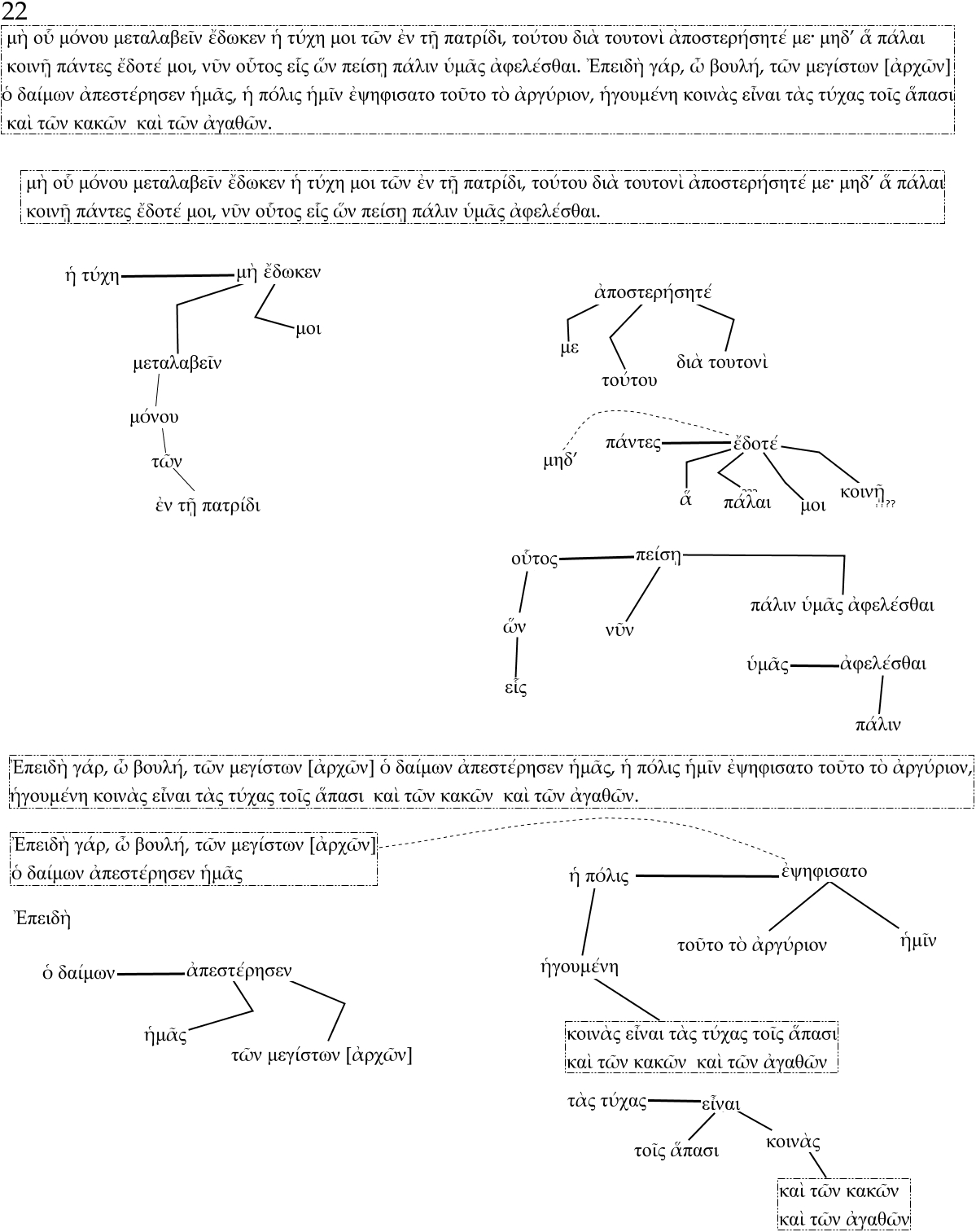 Este Cmap, tiene información relacionada con: frag. 22 imprimir, τοῦτο τὸ ἀργύριον ???? ἐψηφισατο, πάλιν ὑμᾶς ἀφελέσθαι ???? πείσῃ, ἔδοτέ ???? μοι, ἡ τύχη ???? μὴ ἔδωκεν, τοῖς ἅπασι ???? εἶναι, τούτου ???? ἀποστερήσητέ, κοινὰς ???? εἶναι, Ἐπειδὴ γάρ, ὦ βουλή, τῶν μεγίστων [ἀρχῶν] ὁ δαίμων ἀπεστέρησεν ἡμᾶς ???? ἐψηφισατο, νῦν ???? πείσῃ, μόνου ???? μεταλαβεῖν, ἀφελέσθαι ???? πάλιν, ἔδοτέ ??? πάλαι, ἅ ???? ἔδοτέ, τῶν μεγίστων [ἀρχῶν] ???? ἀπεστέρησεν, ὑμᾶς ???? ἀφελέσθαι, ἔδοτέ ???? κοινῇ, διὰ τουτονὶ ???? ἀποστερήσητέ, τὰς τύχας ???? εἶναι, καὶ τῶν κακῶν καὶ τῶν ἀγαθῶν ???? κοινὰς, μοι ???? μὴ ἔδωκεν