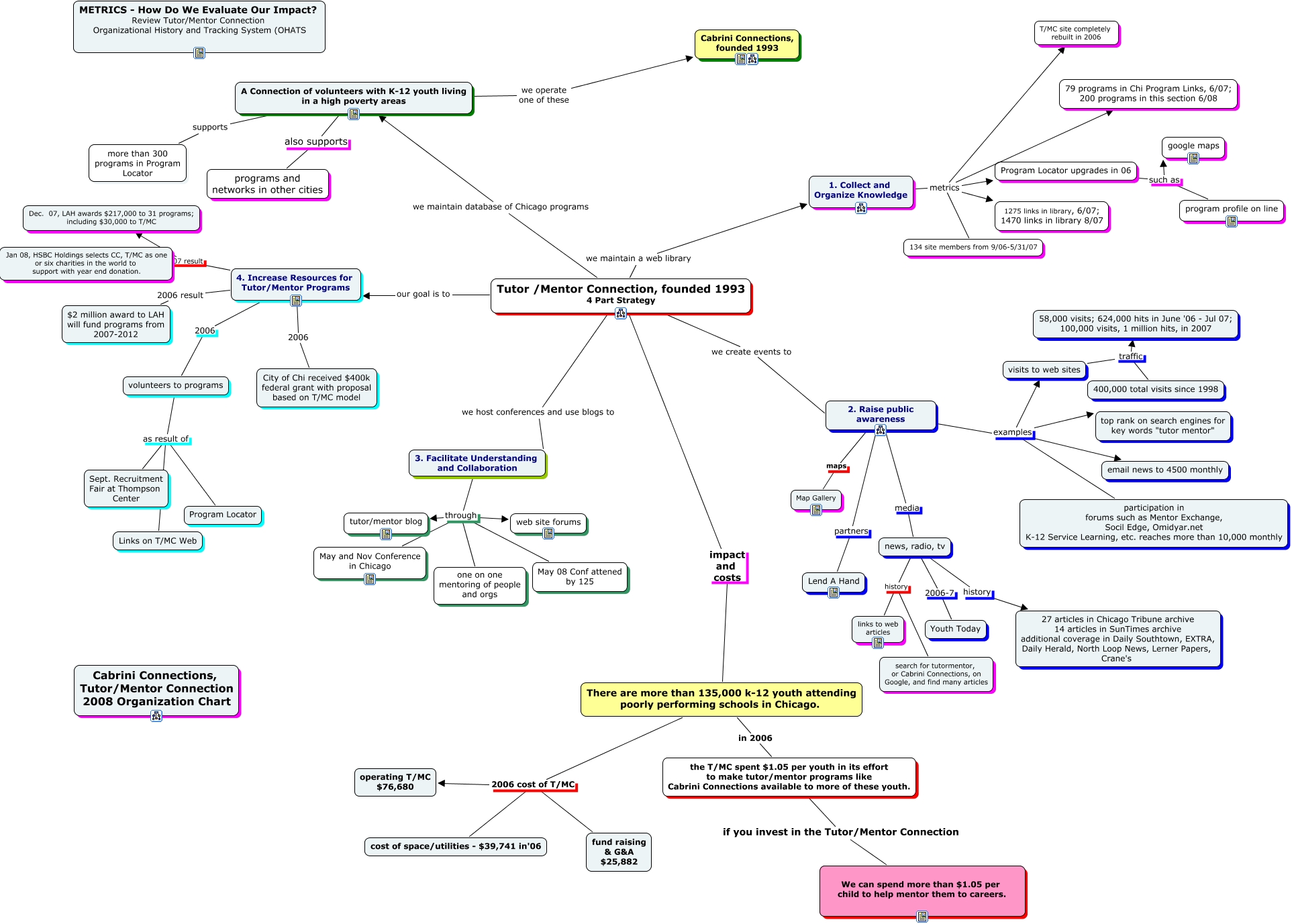 This Concept Map has information related to: metrics, news, radio, tv 2006-7 Youth Today, 1. Collect and Organize Knowledge metrics 79 programs in Chi Program Links, 6/07; 200 programs in this section 6/08, 4. Increase Resources for Tutor/Mentor Programs 2007 result Dec. 07, LAH awards $217,000 to 31 programs; including $30,000 to T/MC, Program Locator upgrades in 06 such as google maps, 3. Facilitate Understanding and Collaboration through May 08 Conf attened by 125, A Connection of volunteers with K-12 youth living in a high poverty areas also supports programs and networks in other cities, 1. Collect and Organize Knowledge metrics 1275 links in library, 6/07; 1470 links in library 8/07, 2. Raise public awareness partners Lend A Hand, news, radio, tv history links to web articles, There are more than 135,000 k-12 youth attending poorly performing schools in Chicago. 2006 cost of T/MC operating T/MC $76,680