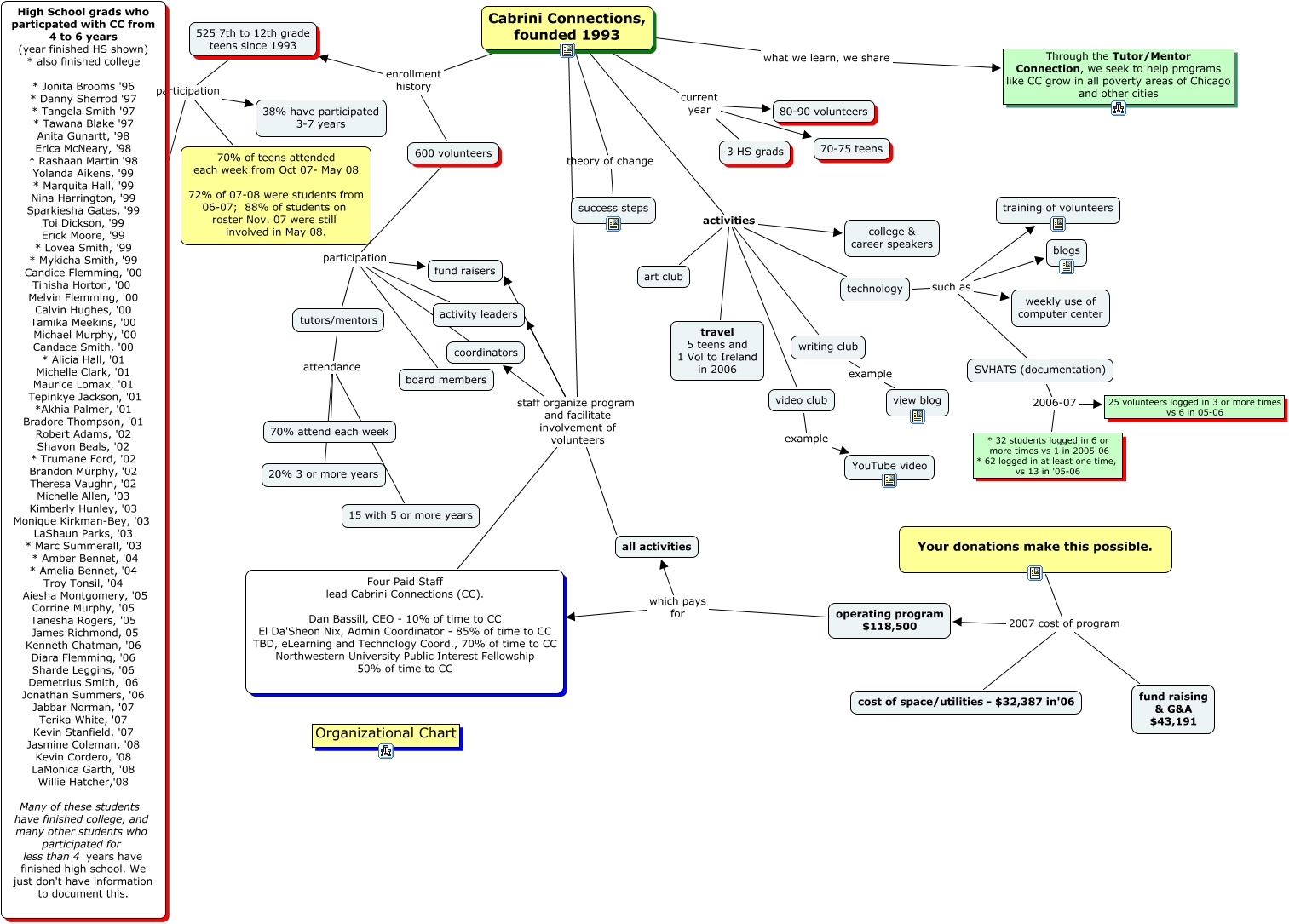 This Concept Map has information related to: metrics for Cabrini Connections, SVHATS (documentation) 2006-07 * 32 students logged in 6 or more times vs 1 in 2005-06 * 62 logged in at least one time, vs 13 in '05-06, Cabrini Connections, founded 1993 activities video club, 600 volunteers participation fund raisers, tutors/mentors attendance 15 with 5 or more years, 525 7th to 12th grade teens since 1993 participation High School grads who particpated with CC from 4 to 6 years (year finished HS shown) * also finished college * Jonita Brooms '96 * Danny Sherrod '97 * Tangela Smith '97 * Tawana Blake '97 Anita Gunartt, '98 Erica McNeary, '98 * Rashaan Martin '98 Yolanda Aikens, '99 * Marquita Hall, '99 Nina Harrington, '99 Sparkiesha Gates, '99 Toi Dickson, '99 Erick Moore, '99 * Lovea Smith, '99 * Mykicha Smith, '99 Candice Flemming, '00 Tihisha Horton, '00 Melvin Flemming, '00 Calvin Hughes, '00 Tamika Meekins, '00 Michael Murphy, '00 Candace Smith, '00 * Alicia Hall, '01 Michelle Clark, '01 Maurice Lomax, '01 Tepinkye Jackson, '01 *Akhia Palmer, '01 Bradore Thompson, '01 Robert Adams, '02 Shavon Beals, '02 * Trumane Ford, '02 Brandon Murphy, '02 Theresa Vaughn, '02 Michelle Allen, '03 Kimberly Hunley, '03 Monique Kirkman-Bey, '03 LaShaun Parks, '03 * Marc Summerall, '03 * Amber Bennet, '04 * Amelia Bennet, '04 Troy Tonsil, '04 Aiesha Montgomery, '05 Corrine Murphy, '05 Tanesha Rogers, '05 James Richmond, 05 Kenneth Chatman, '06 Diara Flemming, '06 Sharde Leggins, '06 Demetrius Smith, '06 Jonathan Summers, '06 Jabbar Norman, '07 Terika White, '07 Kevin Stanfield, '07 Jasmine Coleman, '08 Kevin Cordero, '08 LaMonica Garth, '08 Willie Hatcher,'08 Many of these students have finished college, and many other students who participated for less than 4 years have finished high school. We just don't have information to document this., technology such as blogs, Cabrini Connections, founded 1993 theory of change success steps, Cabrini Connections, founded 1993 staff organize program and facilitate involvement of volunteers Four Paid Staff lead Cabrini Connections (CC). Dan Bassill, CEO - 10% of time to CC El Da'Sheon Nix, Admin Coordinator - 85% of time to CC TBD, eLearning and Technology Coord., 70% of time to CC Northwestern University Public Interest Fellowship 50% of time to CC, Cabrini Connections, founded 1993 enrollment history 600 volunteers, 525 7th to 12th grade teens since 1993 participation 70% of teens attended each week from Oct 07- May 08 72% of 07-08 were students from 06-07; 88% of students on roster Nov. 07 were still involved in May 08.