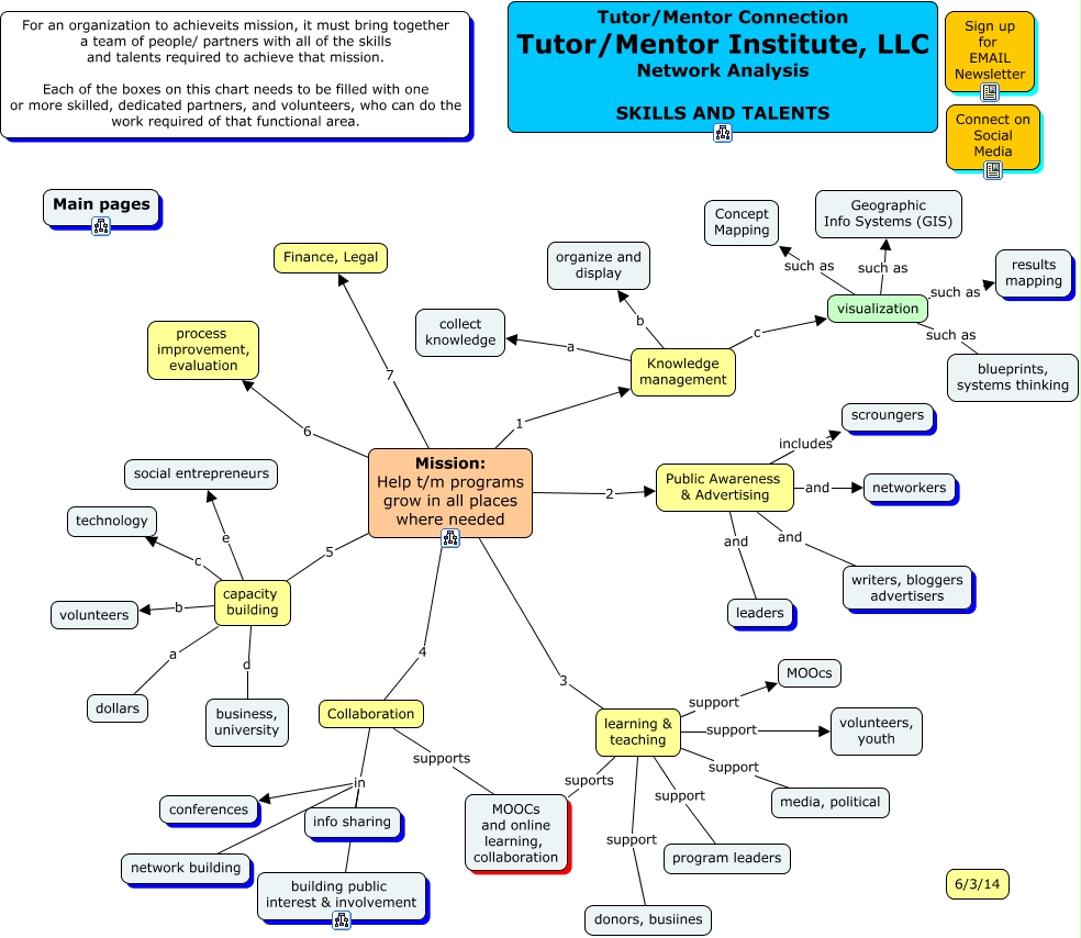 This Concept Map, created with IHMC CmapTools, has information related to: Tutor Mentor Connection Network Analysis - Skills, capacity building c technology, Collaboration in conferences, learning & teaching support volunteers, youth, learning & teaching support program leaders, Public Awareness & Advertising includes scroungers, Collaboration in building public interest & involvement, learning & teaching suports MOOCs and online learning, collaboration, Knowledge management c visualization, visualization such as Concept Mapping, Collaboration supports ????, visualization such as blueprints, systems thinking, Public Awareness & Advertising and networkers, learning & teaching support donors, busiines, learning & teaching support media, political, Collaboration in network building, capacity building b volunteers, visualization such as results mapping, Mission: Help t/m programs grow in all places where needed 5 capacity building, Knowledge management a collect knowledge, Mission: Help t/m programs grow in all places where needed 1 Knowledge management