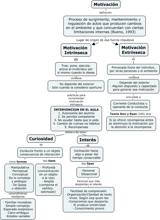 Este Cmap, tiene información relacionada con: Psicología. Motivación intrínseca. Curiosidad e interes, Conducta frente a un objeto consecuencia de interacción dos tipos · Profunda (concentración en un objeto a la vez) · Amplia (comporta el cambio, estimular), Curiosidad es Conducta frente a un objeto consecuencia de interacción, Trae, pone, ejecuta, activa el invdividuo por sí mismo cuando lo desea conlleva · No depende del exterior · Sólo cuando la considera oportuno, · Depende del exterior · Alguien dispuesto y capacitado para generar esa motivación vinculada a Corriente Conductista u operante de la conducta, Interés es Inclinación hacia algo a pesar del tiempo conservable, Inclinación hacia algo a pesar del tiempo conservable dos tipos · Personal · Situacional, Proceso de surgimiento, mantenimiento y regulación de actos que producen cambios en el ambiente y que concuerdan con ciertas limitaciones internas (Bueno, 1993) Lugar de origen de esa fuerza impulsiva Motivación Extrínseca, Motivación definición Proceso de surgimiento, mantenimiento y regulación de actos que producen cambios en el ambiente y que concuerdan con ciertas limitaciones internas (Bueno, 1993), Motivación Intrínseca es Trae, pone, ejecuta, activa el invdividuo por sí mismo cuando lo desea, Provocada fuera del individuo, por otras personas o el ambiente conlleva · Depende del exterior · Alguien dispuesto y capacitado para generar esa motivación, Proceso de surgimiento, mantenimiento y regulación de actos que producen cambios en el ambiente y que concuerdan con ciertas limitaciones internas (Bueno, 1993) Lugar de origen de esa fuerza impulsiva Motivación Intrínseca, INTERVENCION EN EL AULA 1. Autonomía del alumno 2. Se perciba competente 3. No ayudar hasta que lo pida 4. Cambio de rutinas-no hábitos 5. Recompensas debiera de tener Interés, · Manipulativa · Perceptual · Conceptual · De lo complejo y ambiguo · De Queja u objeción características medidoras · Familiar-novedoso ·Simple-complejo ·Esperado-sorpresivo · Claro-ambiguo ·Estable-variable, · Personal · Situacional Factores que más despiertan el interés Facilidad de comprensión · Organización/Claridad de texto ·Vivez. Según exp quien lee ·Compromiso que despierta. · Si produce emotividad · Conocimiento previo, INTERVENCION EN EL AULA 1. Autonomía del alumno 2. Se perciba competente 3. No ayudar hasta que lo pida 4. Cambio de rutinas-no hábitos 5. Recompensas debiera de tener Curiosidad, Motivación Extrínseca es Provocada fuera del individuo, por otras personas o el ambiente, · No depende del exterior · Sólo cuando la considera oportuno prácticas para incrementar motivación intrínseca INTERVENCION EN EL AULA 1. Autonomía del alumno 2. Se perciba competente 3. No ayudar hasta que lo pida 4. Cambio de rutinas-no hábitos 5. Recompensas, Conducta frente a un objeto consecuencia de interacción cinco formas · Manipulativa · Perceptual · Conceptual · De lo complejo y ambiguo · De Queja u objeción, Corriente Conductista u operante de la conducta Teoria Deci y Ryan (200) dice Si se ofrece recompensa antes se disminuye la motivación por la atención a la recompensa