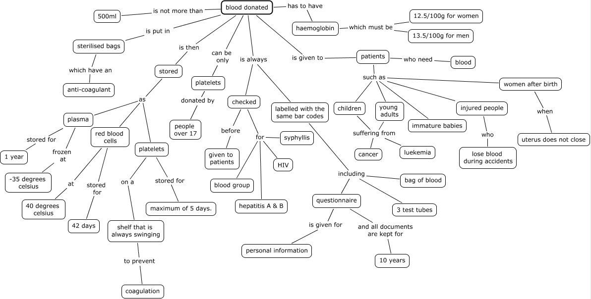 This Concept Map, created with IHMC CmapTools, has information related to: NICOLE H POST, blood donated is always checked, blood donated is then stored, questionnaire and all documents are kept for 10 years, patients such as children, blood donated can be only platelets, blood donated is not more than 500ml, young adults suffering from luekemia, red blood cells at 40 degrees celsius, plasma frozen at -35 degrees celsius, plasma stored for 1 year, patients who need blood, questionnaire is given for personal information, labelled with the same bar codes including bag of blood, shelf that is always swinging to prevent coagulation, patients such as women after birth, red blood cells stored for 42 days, checked for HIV, blood donated is put in sterilised bags, haemoglobin which must be 12.5/100g for women, checked for hepatitis A & B
