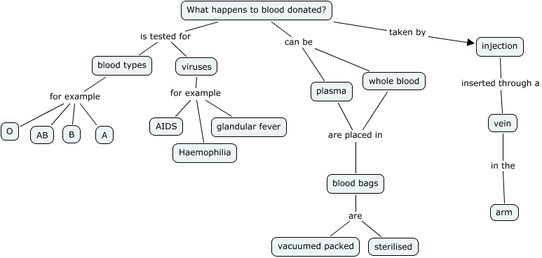 This Concept Map, created with IHMC CmapTools, has information related to: SOPHIE B POST, viruses for example AIDS, whole blood are placed in blood bags, What happens to blood donated? taken by injection, What happens to blood donated? can be whole blood, plasma are placed in blood bags, injection inserted through a vein, blood types for example AB, blood types for example B, vein in the arm, viruses for example Haemophilia, What happens to blood donated? can be plasma, blood bags are sterilised, viruses for example glandular fever, What happens to blood donated? is tested for viruses, blood bags are vacuumed packed, blood types for example A, blood types for example O, What happens to blood donated? is tested for blood types