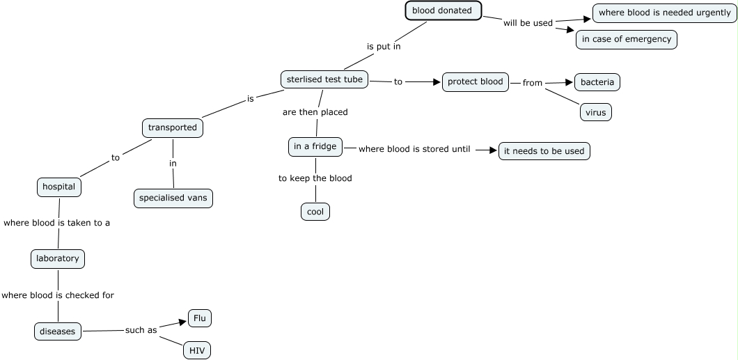 This Concept Map, created with IHMC CmapTools, has information related to: NICOLE C PRE, protect blood from bacteria, diseases such as HIV, sterlised test tube are then placed in a fridge, sterlised test tube is transported, laboratory where blood is checked for diseases, transported to hospital, in a fridge where blood is stored until it needs to be used, blood donated will be used where blood is needed urgently, hospital where blood is taken to a laboratory, protect blood from virus, blood donated is put in sterlised test tube, transported in specialised vans, blood donated will be used in case of emergency, in a fridge to keep the blood cool, sterlised test tube to protect blood, diseases such as Flu