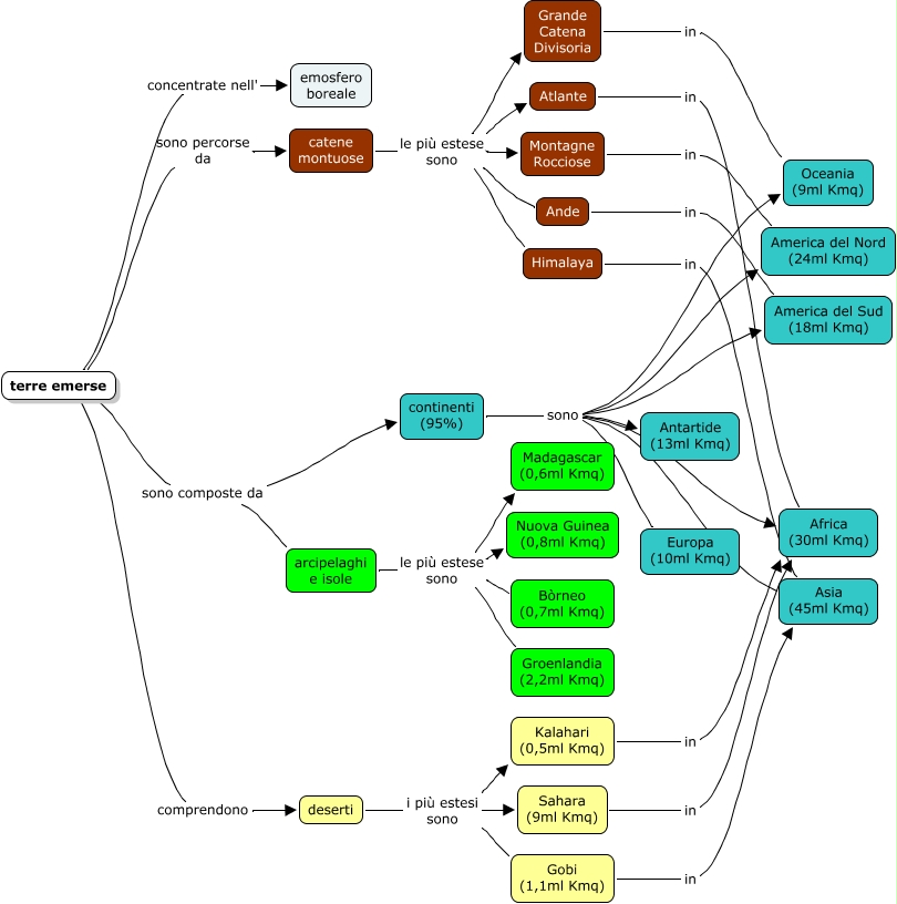 Questa Cmap, creata con IHMC CmapTools, contiene informazioni relative a: 313 Terre emerse, continenti (95%) sono America del Nord (24ml Kmq), terre emerse concentrate nell' emosfero boreale, arcipelaghi e isole le più estese sono Madagascar (0,6ml Kmq), arcipelaghi e isole le più estese sono Bòrneo (0,7ml Kmq), deserti i più estesi sono Gobi (1,1ml Kmq), catene montuose le più estese sono Ande, Atlante in Africa (30ml Kmq), catene montuose le più estese sono Himalaya, terre emerse comprendono deserti, Ande in America del Sud (18ml Kmq), deserti i più estesi sono Kalahari (0,5ml Kmq), Montagne Rocciose in America del Nord (24ml Kmq), continenti (95%) sono Europa (10ml Kmq), Grande Catena Divisoria in Oceania (9ml Kmq), terre emerse sono composte da continenti (95%), catene montuose le più estese sono Atlante, continenti (95%) sono Asia (45ml Kmq), Sahara (9ml Kmq) in Africa (30ml Kmq), arcipelaghi e isole le più estese sono Nuova Guinea (0,8ml Kmq), deserti i più estesi sono Sahara (9ml Kmq)