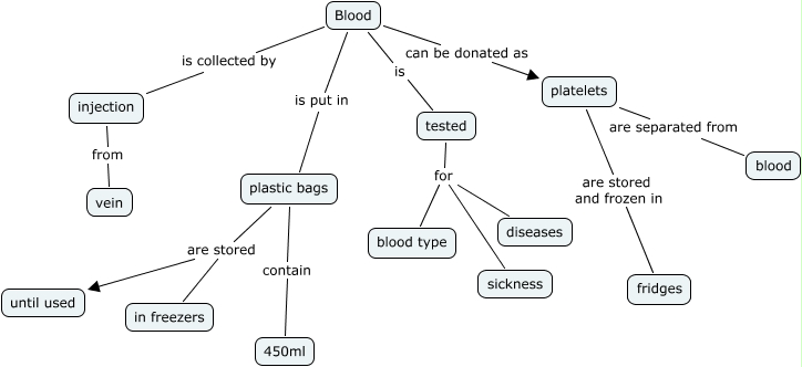 This Concept Map, created with IHMC CmapTools, has information related to: ZAK POST, plastic bags are stored until used, Blood is put in plastic bags, Blood can be donated as platelets, tested for blood type, plastic bags are stored in freezers, tested for diseases, Blood is tested, platelets are separated from blood, tested for sickness, platelets are stored and frozen in fridges, injection from vein, Blood is collected by injection, plastic bags contain 450ml