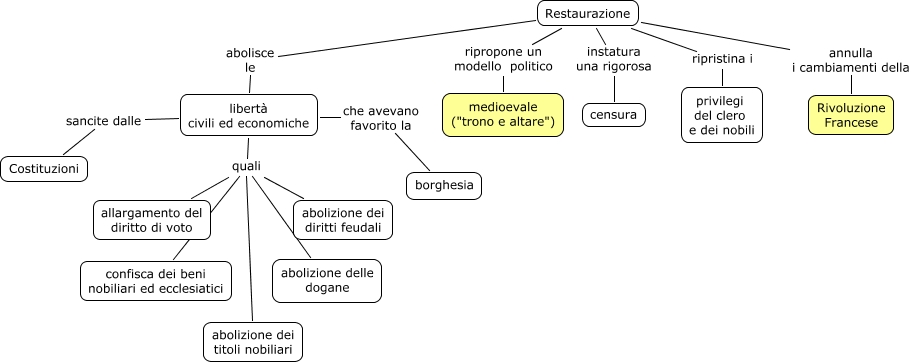 Questa Cmap, creata con IHMC CmapTools, contiene informazioni relative a: 03) Restaurazione, libertà civili ed economiche quali abolizione dei diritti feudali, Restaurazione ripropone un modello politico medioevale ("trono e altare"), libertà civili ed economiche quali abolizione delle dogane, Restaurazione ripristina i privilegi del clero e dei nobili, libertà civili ed economiche quali abolizione dei titoli nobiliari, Restaurazione abolisce le libertà civili ed economiche, libertà civili ed economiche quali allargamento del diritto di voto, Restaurazione instatura una rigorosa censura, libertà civili ed economiche quali confisca dei beni nobiliari ed ecclesiatici, libertà civili ed economiche che avevano favorito la borghesia, Restaurazione annulla i cambiamenti della Rivoluzione Francese, libertà civili ed economiche sancite dalle Costituzioni