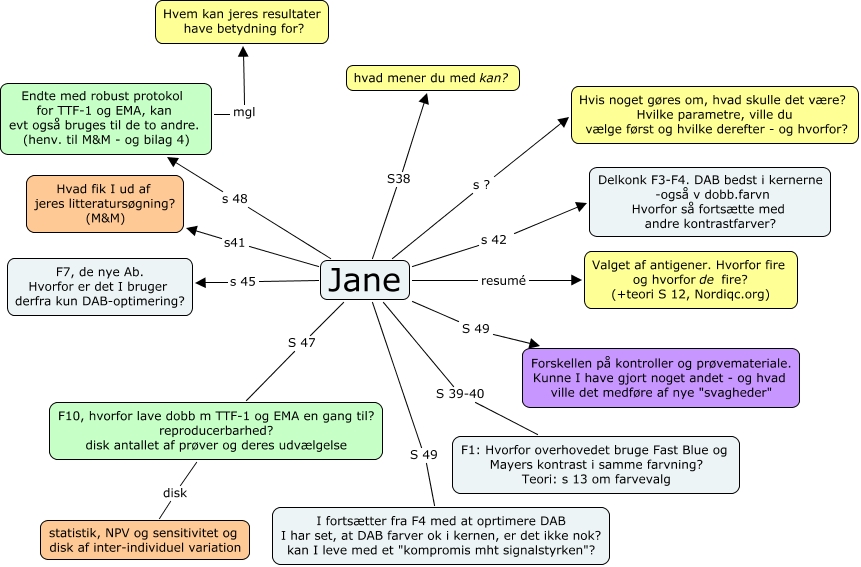 This Concept Map, created with IHMC CmapTools, has information related to: Jane, Jane S 47 F10, hvorfor lave dobb m TTF-1 og EMA en gang til? reproducerbarhed? disk antallet af prøver og deres udvælgelse, Jane s 48 Endte med robust protokol for TTF-1 og EMA, kan evt også bruges til de to andre. (henv. til M&M - og bilag 4), F10, hvorfor lave dobb m TTF-1 og EMA en gang til? reproducerbarhed? disk antallet af prøver og deres udvælgelse disk statistik, NPV og sensitivitet og disk af inter-individuel variation, Jane resumé Valget af antigener. Hvorfor fire og hvorfor de fire? (+teori S 12, Nordiqc.org), Jane s41 Hvad fik I ud af jeres litteratursøgning? (M&M), Jane s ? Hvis noget gøres om, hvad skulle det være? Hvilke parametre, ville du vælge først og hvilke derefter - og hvorfor?, Jane s 42 Delkonk F3-F4. DAB bedst i kernerne -også v dobb.farvn Hvorfor så fortsætte med andre kontrastfarver?, Endte med robust protokol for TTF-1 og EMA, kan evt også bruges til de to andre. (henv. til M&M - og bilag 4) mgl Hvem kan jeres resultater have betydning for?, Jane S38 hvad mener du med kan?, Jane S 39-40 F1: Hvorfor overhovedet bruge Fast Blue og Mayers kontrast i samme farvning? Teori: s 13 om farvevalg, Jane s 45 F7, de nye Ab. Hvorfor er det I bruger derfra kun DAB-optimering?, Jane S 49 I fortsætter fra F4 med at oprtimere DAB I har set, at DAB farver ok i kernen, er det ikke nok? kan I leve med et "kompromis mht signalstyrken"?, Jane S 49 Forskellen på kontroller og prøvemateriale. Kunne I have gjort noget andet - og hvad ville det medføre af nye "svagheder"