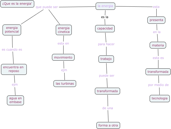LA ENERGIA, energia potencial es cuando es encuentra en reposo, capacidad para hacer trabajo, movimiento ejm las turbinas, materia esta es transformada, la energia esta presenta, trabajo puede ser transformada, transformada por medio de tecnologia, encuentra en reposo ejm agua en embase, presenta en la materia, transformada de una forma a otra