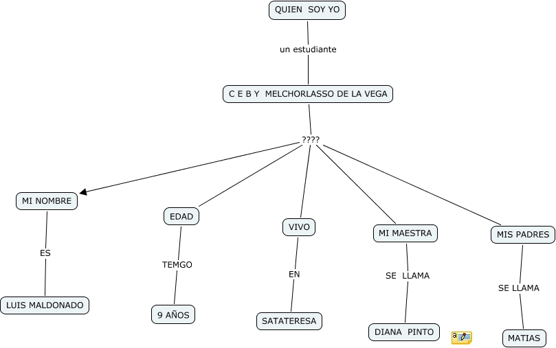 Este Cmap, tiene información relacionada con: QUIEN SOY YO, MI MAESTRA SE LLAMA DIANA PINTO, C E B Y MELCHORLASSO DE LA VEGA ???? MIS PADRES, MI NOMBRE ES LUIS MALDONADO, QUIEN SOY YO un estudiante C E B Y MELCHORLASSO DE LA VEGA, C E B Y MELCHORLASSO DE LA VEGA ???? EDAD, VIVO EN SATATERESA, C E B Y MELCHORLASSO DE LA VEGA ???? VIVO, MIS PADRES SE LLAMA MATIAS, EDAD TEMGO 9 AÑOS, C E B Y MELCHORLASSO DE LA VEGA ???? MI NOMBRE, C E B Y MELCHORLASSO DE LA VEGA ???? MI MAESTRA