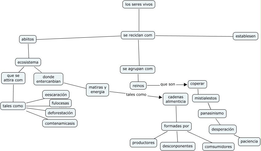 Este Cmap, tiene información relacionada con: Sinlos seres vivos, se agrupan com ???? reinos, formadas por ???? desconponentes, que se attira com ???? tales como, ecosistema ???? donde entercanbian, ecosistema ???? que se attira com, mistialestos ???? panasinismo, formadas por ???? productores, tales como ???? deforestación, se reciclan com ???? establesen, formadas por ???? comsumidores, matiras y energia tales como cadenas alimenticia, se reciclan com ???? se agrupan com, tales como ???? fulocesas, reinos que son coperar, abiitos ???? ecosistema, cadenas alimenticia ???? formadas por, los seres vivos ???? se reciclan com, desperación ???? paciencia, coperar ???? mistialestos, panasinismo ???? desperación