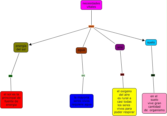 Este Cmap, tiene información relacionada con: necesidades vitales, aire es el oxigeno del aire es rural a casi todas los seres vivos para poder respirar, energía del sol es el sol es la princinpal de fuente de energia, necesidades vitales son agua, necesidades vitales son aire, agua es la mayoria seres vivos requiere agua, suelo es en el suelo vive gran cantidad de organismo, necesidades vitales son energía del sol, necesidades vitales son suelo