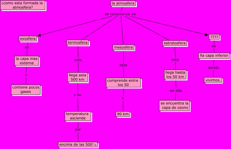 Este Cmap, tiene información relacionada con: LA ATMOSFERA, llega hasta los 50 km en ella se encuentra la capa de ozono, ña capa inferior donde vivimos., comprende entre los 50 y 80 km, termosfera esta llega asta 500 km, la atmosfera se caracteriza asi estratosfera, la capa mas externa y contiene pocos gases, mesosfera esta comprende entre los 50, ???? es ña capa inferior, la atmosfera se caracteriza asi ????, llega asta 500 km y su temperatura asciende, temperatura asciende por encima de las 500° c, la atmosfera se caracteriza asi exosfera, exosfera es la capa mas externa, la atmosfera se caracteriza asi mesosfera, estratosfera esta llega hasta los 50 km, la atmosfera se caracteriza asi termosfera