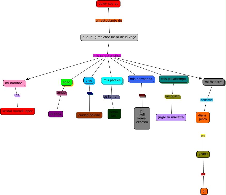 Este Cmap, tiene información relacionada con: quien soy yo, c. e. b. g melchor lasso de la vega mis caracteristica mi nombre, c. e. b. g melchor lasso de la vega mis caracteristica mis pasatiempo, mi maestra sellama diana pinto, grupo es 3f, mis pasatiempo me gusta jugar la maestra, c. e. b. g melchor lasso de la vega mis caracteristica mis hermanos, edad tengo 8 años, c. e. b. g melchor lasso de la vega mis caracteristica mi maestra, diana pinto mi grupo, c. e. b. g melchor lasso de la vega mis caracteristica vivo, c. e. b. g melchor lasso de la vega mis caracteristica mis padres, mis hermanos son yili yuli kenia ernesto, vivo en ciudad bolivar, quien soy yo un estudiante de c. e. b. g melchor lasso de la vega, mi nombre es kristal mariell lopez, mis padres se llaman sonia luis, c. e. b. g melchor lasso de la vega mis caracteristica edad