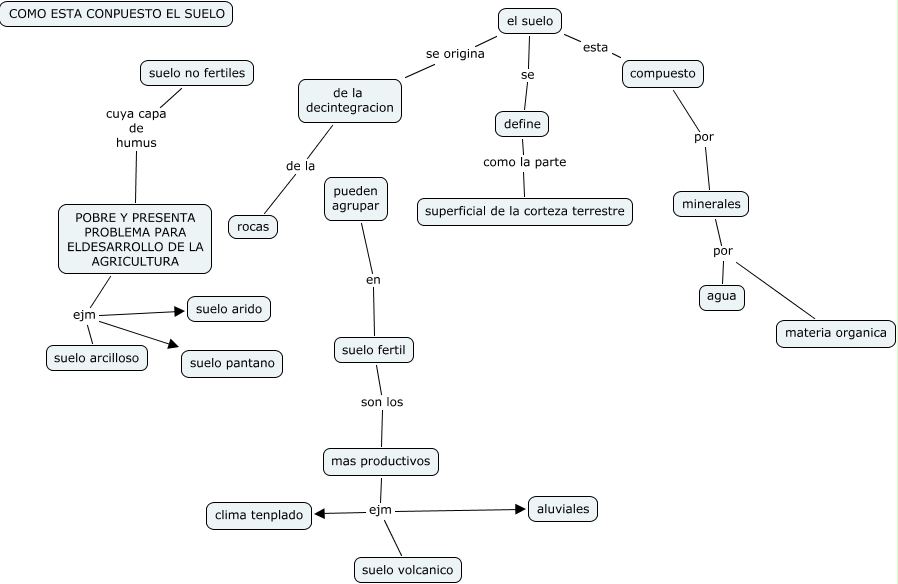 el suelo, suelo no fertiles cuya capa de humus POBRE Y PRESENTA PROBLEMA PARA ELDESARROLLO DE LA AGRICULTURA, minerales por materia organica, compuesto por minerales, mas productivos ejm aluviales, mas productivos ejm clima tenplado, POBRE Y PRESENTA PROBLEMA PARA ELDESARROLLO DE LA AGRICULTURA ejm suelo arido, pueden agrupar en suelo fertil, POBRE Y PRESENTA PROBLEMA PARA ELDESARROLLO DE LA AGRICULTURA ejm suelo arcilloso, mas productivos ejm suelo volcanico, el suelo se origina de la decintegracion