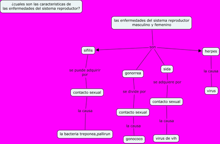 las emfermedades del sistema reproductor masculino y femenino, las enfermedades del sistema reproductor masculino y femenino son sida, sida se adquiere por contacto sexual, contacto sexual la causa virus de vih, contacto sexual la causa la bacteria treponea,pallirun, las enfermedades del sistema reproductor masculino y femenino son sifilis, herpes la causa virus, gonorrea se divide por contacto sexual, contacto sexual la causa gonococo, las enfermedades del sistema reproductor masculino y femenino son gonorrea, las enfermedades del sistema reproductor masculino y femenino son herpes