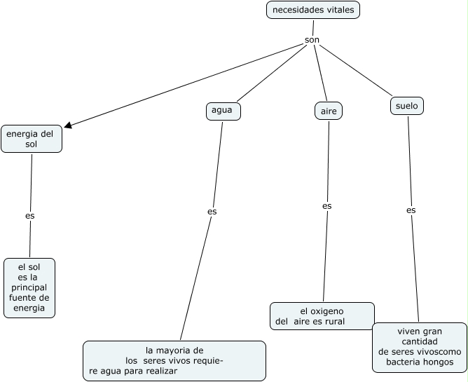 Este Cmap, tiene información relacionada con: necesidades vitales, suelo es viven gran cantidad de seres vivoscomo bacteria hongos, necesidades vitales son energia del sol, energia del sol es el sol es la principal fuente de energia, necesidades vitales son agua, agua es la mayoria de los seres vivos requie- re agua para realizar, aire es el oxigeno del aire es rural, necesidades vitales son aire, necesidades vitales son suelo