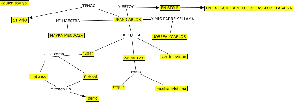Este Cmap, tiene información relacionada con: JEAN, JEAN CARLOS me gusta jugar, JEAN CARLOS MI MAESTRA MAYRA MENDOZA, futbool y tengo un perro, oir musica como regue, JEAN CARLOS me gusta ver televicion, jugar nintendo, nintendo y tengo un perro, JEAN CARLOS Y ESTOY EN LA ESCUELA MELCHOL LASSO DE LA VEGA, JEAN CARLOS TENGO 11 AÑO, JEAN CARLOS me gusta oir musica, oir musica como musica cristiana, JEAN CARLOS Y ESTOY EN 6TO E, JEAN CARLOS Y MIS PADRE SELLAMA JOSEFA YCARLOS, jugar cosa como futbool