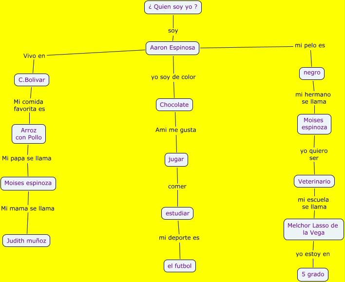 Este Cmap, tiene información relacionada con: quien soy yo, Aaron Espinosa mi pelo es negro, Veterinario mi escuela se llama Melchor Lasso de la Vega, Moises espinoza yo quiero ser Veterinario, negro mi hermano se llama Moises espinoza, Aaron Espinosa Vivo en C.Bolivar, Melchor Lasso de la Vega yo estoy en 5 grado, Chocolate Ami me gusta jugar, Arroz con Pollo Mi papa se llama Moises espinoza, Moises espinoza Mi mama se llama Judith muñoz, Aaron Espinosa yo soy de color Chocolate, estudiar mi deporte es el futbol, jugar comer estudiar, C.Bolivar Mi comida favorita es Arroz con Pollo, ¿ Quien soy yo ? soy Aaron Espinosa