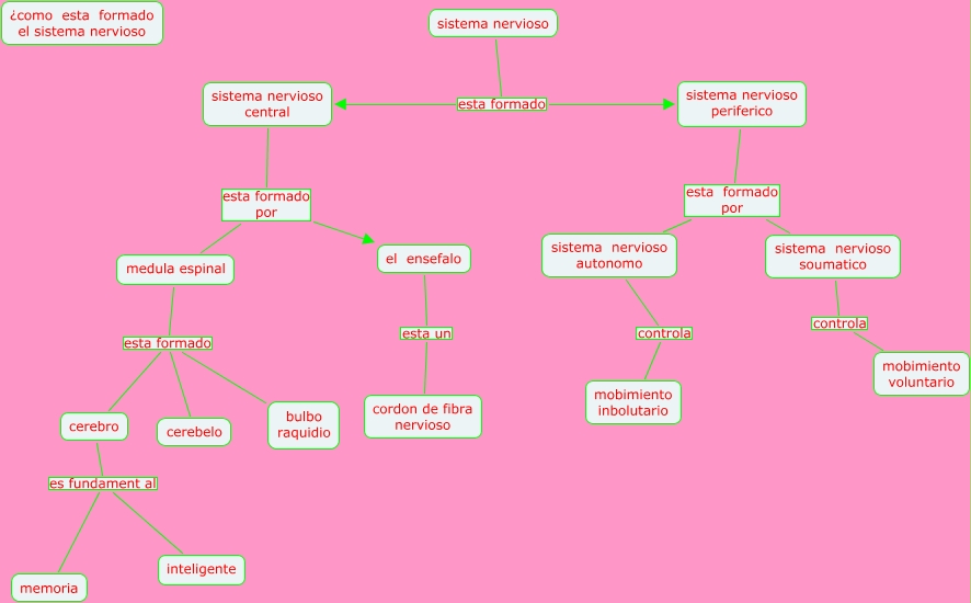 Este Cmap, tiene información relacionada con: sistema nervioso, sistema nervioso periferico esta formado por sistema nervioso autonomo, sistema nervioso autonomo controla mobimiento inbolutario, el ensefalo esta un cordon de fibra nervioso, sistema nervioso esta formado sistema nervioso central, medula espinal esta formado bulbo raquidio, cerebro es fundament al inteligente, sistema nervioso periferico esta formado por sistema nervioso soumatico, medula espinal esta formado cerebro, sistema nervioso esta formado sistema nervioso periferico, sistema nervioso central esta formado por medula espinal, sistema nervioso central esta formado por el ensefalo, sistema nervioso soumatico controla mobimiento voluntario, cerebro es fundament al memoria, medula espinal esta formado cerebelo