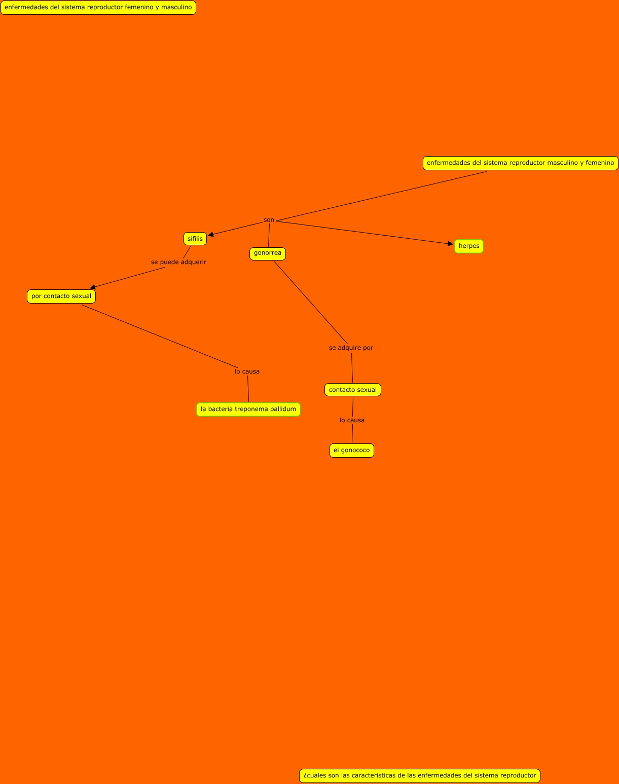 enfermedades del sistema reproductor, sifilis se puede adquerir por contacto sexual, enfermedades del sistema reproductor masculino y femenino son sifilis, contacto sexual lo causa el gonococo, gonorrea se adquire por contacto sexual, enfermedades del sistema reproductor masculino y femenino son gonorrea, enfermedades del sistema reproductor masculino y femenino son herpes, por contacto sexual lo causa la bacteria treponema pallidum