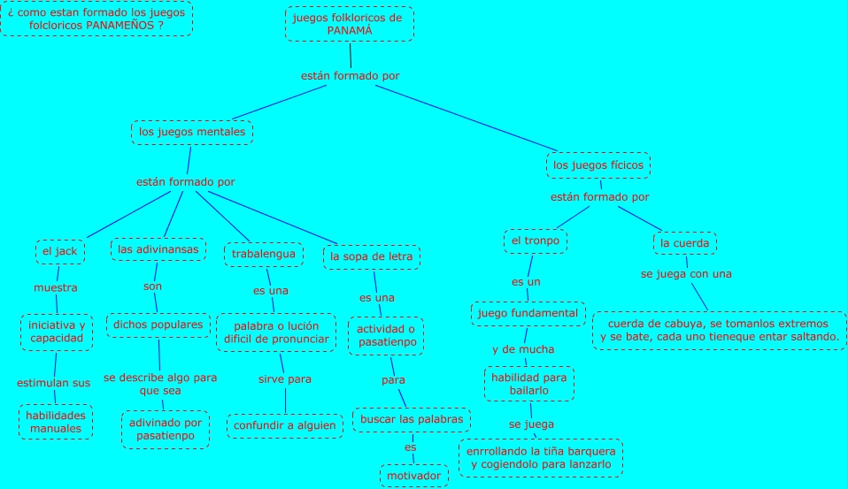 Este Cmap, tiene información relacionada con: juegos folkloricos de PANAM�?, trabalengua es una palabra o lución dificil de pronunciar, palabra o lución dificil de pronunciar sirve para confundir a alguien, el tronpo es un juego fundamental, el jack muestra iniciativa y capacidad, las adivinansas son dichos populares, actividad o pasatienpo para buscar las palabras, juegos folkloricos de PANAM�? están formado por los juegos mentales, la sopa de letra es una actividad o pasatienpo, buscar las palabras es motivador, iniciativa y capacidad estimulan sus habilidades manuales, los juegos mentales están formado por la sopa de letra, juegos folkloricos de PANAM�? están formado por los juegos fícicos, los juegos fícicos están formado por la cuerda, los juegos mentales están formado por las adivinansas, los juegos fícicos están formado por el tronpo, los juegos mentales están formado por trabalengua, los juegos mentales están formado por el jack, habilidad para bailarlo se juega enrrollando la tiña barquera y cogiendolo para lanzarlo, dichos populares se describe algo para que sea adivinado por pasatienpo, juego fundamental y de mucha habilidad para bailarlo