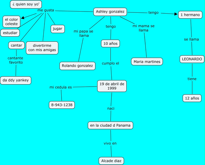 Este Cmap, tiene información relacionada con: QUIEN SOY YO, Ashley gonzalez tengo 1 hermano, Ashley gonzalez mi mama se llama Maria martines, Ashley gonzalez me gusta cantar, 1 hermano se llama LEONARDO, 19 de abril de 1999 mi cedula es 8-943-1238, Ashley gonzalez mi papa se llama Rolando gonzalez, LEONARDO tiene 12 años, Ashley gonzalez tengo 10 años, Ashley gonzalez me gusta estudiar, cantar cantante favorito da ddy yankey, 10 años cumplo el 19 de abril de 1999, Ashley gonzalez me gusta jugar, en la ciudad d Panama vivo en Alcade diaz, Ashley gonzalez me gusta divertirme con mis amigas, 19 de abril de 1999 naci en la ciudad d Panama, Ashley gonzalez me gusta el color celeste
