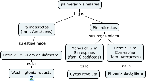 Palmera y similares, palmeras y similares hojas Pinnatisectas, Entre 5-7 m Con espina (fam. Arecáceas) es la Phoenix dactylifera, Menos de 2 m Sin espinas (fam. Cicadáceas) es la Cycas revoluta, Entre 25 y 60 cm de diámetro es la Washingtonia robusta, Pinnatisectas sus hojas miden Menos de 2 m Sin espinas (fam. Cicadáceas), palmeras y similares hojas Palmatisectas (fam. Arecáceas), Pinnatisectas sus hojas miden Entre 5-7 m Con espina (fam. Arecáceas), Palmatisectas (fam. Arecáceas) su estipe mide Entre 25 y 60 cm de diámetro