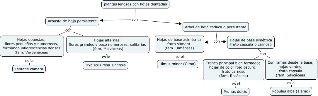 plantas leñosas con hojas dentadas, Árbol de hoja caduca o persistente con Hojas de base asimétrica fruto sámara (fam. Ulmáceas), Hojas alternas; flores grandes y poco numerosas, solitarias (fam. Malváceas) es la Hybiscus rosa-sinensis, Arbusto de hoja persistente con Hojas opuestas; flores pequeñas y numerosas, formando inflorescencias densas (fam. Verbenáceas), Árbol de hoja caduca o persistente con Hojas de base simétrica fruto cápsula o carnoso, Tronco principal bien formado; hojas de color rojo oscuro; fruto carnoso (fam. Rosáceas) es el Prunus dulcis, Hojas opuestas; flores pequeñas y numerosas, formando inflorescencias densas (fam. Verbenáceas) es la Lantana camara, plantas leñosas con hojas dentadas son Árbol de hoja caduca o persistente, Con ramas desde la base; hojas verdes; fruto cápsula (fam. Salicáceas) es el Populus alba (álamo), Hojas de base simétrica fruto cápsula o carnoso con Tronco principal bien formado; hojas de color rojo oscuro; fruto carnoso (fam. Rosáceas), Hojas de base asimétrica fruto sámara (fam. Ulmáceas) es el Ulmus minor (Olmo)