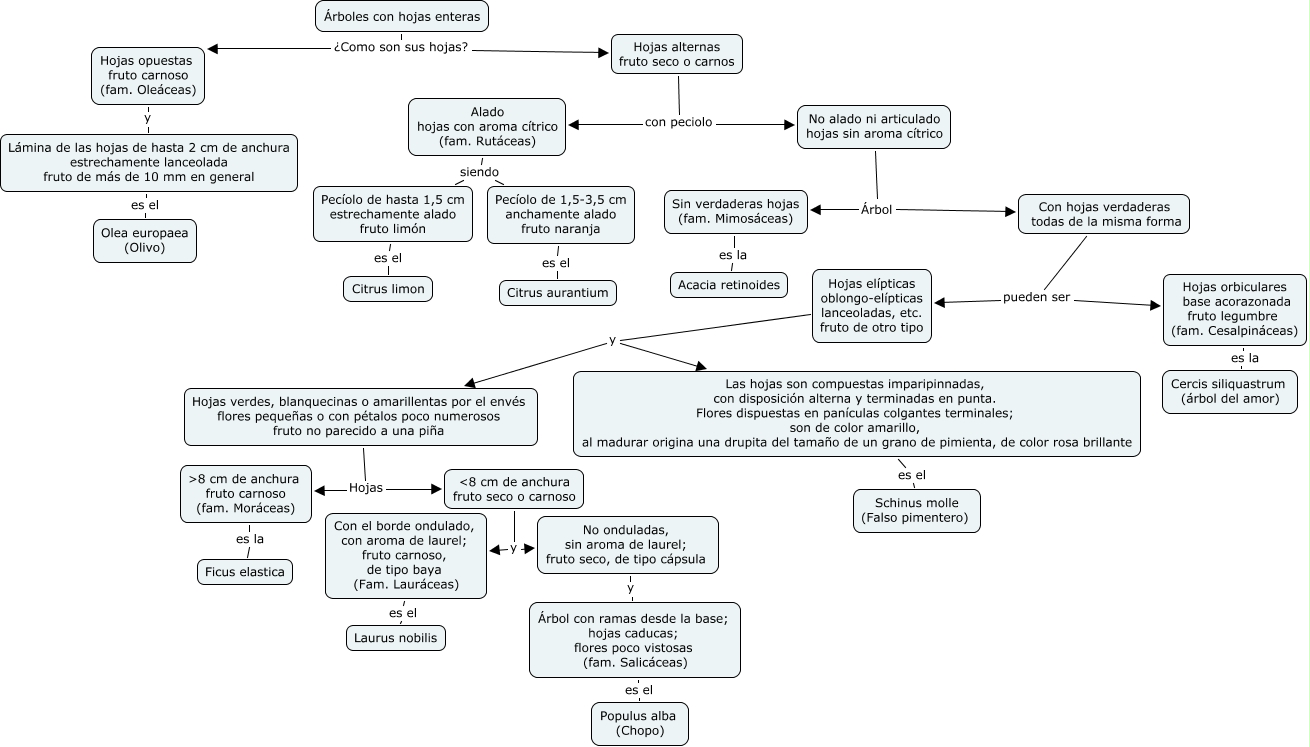 Árboles con hojas enteras, Hojas alternas fruto seco o carnos con peciolo No alado ni articulado hojas sin aroma cítrico, Alado hojas con aroma cítrico (fam. Rutáceas) siendo Pecíolo de 1,5-3,5 cm anchamente alado fruto naranja, Árbol con ramas desde la base; hojas caducas; flores poco vistosas (fam. Salicáceas) es el Populus alba (Chopo), Hojas opuestas fruto carnoso (fam. Oleáceas) y Lámina de las hojas de hasta 2 cm de anchura estrechamente lanceolada fruto de más de 10 mm en general, Hojas alternas fruto seco o carnos con peciolo Alado hojas con aroma cítrico (fam. Rutáceas), Con el borde ondulado, con aroma de laurel; fruto carnoso, de tipo baya (Fam. Lauráceas) es el Laurus nobilis, ɴ cm de anchura fruto carnoso (fam. Moráceas) es la Ficus elastica, Árboles con hojas enteras ¿Como son sus hojas? Hojas alternas fruto seco o carnos, Sin verdaderas hojas (fam. Mimosáceas) es la Acacia retinoides, Pecíolo de 1,5-3,5 cm anchamente alado fruto naranja es el Citrus aurantium