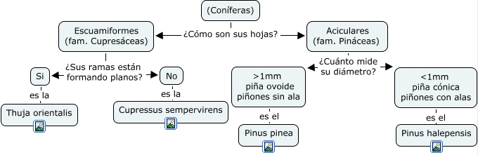 coniferas, Aciculares (fam. Pináceas) ¿Cuánto mide su diámetro? əmm piña cónica piñones con alas, əmm piña cónica piñones con alas es el Pinus halepensis, ɭmm piña ovoide piñones sin ala es el Pinus pinea, (Coníferas) ¿Cómo son sus hojas? Escuamiformes (fam. Cupresáceas), (Coníferas) ¿Cómo son sus hojas? Aciculares (fam. Pináceas), Aciculares (fam. Pináceas) ¿Cuánto mide su diámetro? ɭmm piña ovoide piñones sin ala, Escuamiformes (fam. Cupresáceas) ¿Sus ramas están formando planos? Si, Escuamiformes (fam. Cupresáceas) ¿Sus ramas están formando planos? No, No es la Cupressus sempervirens, Si es la Thuja orientalis