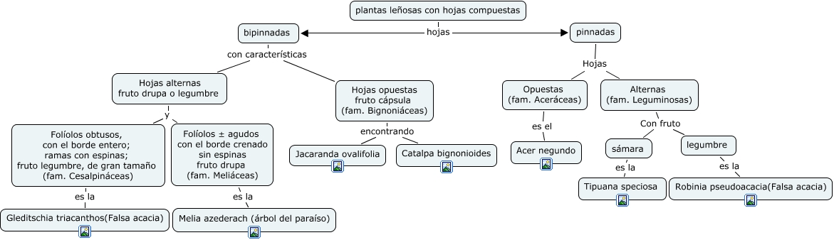 plantas leñosas con hojas compuestas, Hojas opuestas fruto cápsula (fam. Bignoniáceas) encontrando Jacaranda ovalifolia, pinnadas Hojas Opuestas (fam. Aceráceas), Hojas alternas fruto drupa o legumbre y Folíolos ± agudos con el borde crenado sin espinas fruto drupa (fam. Meliáceas), Folíolos ± agudos con el borde crenado sin espinas fruto drupa (fam. Meliáceas) es la Melia azederach (árbol del paraíso), Alternas (fam. Leguminosas) Con fruto legumbre, bipinnadas con características Hojas opuestas fruto cápsula (fam. Bignoniáceas), legumbre es la Robinia pseudoacacia(Falsa acacia), plantas leñosas con hojas compuestas hojas pinnadas, Hojas alternas fruto drupa o legumbre y Folíolos obtusos, con el borde entero; ramas con espinas; fruto legumbre, de gran tamaño (fam. Cesalpináceas), Folíolos obtusos, con el borde entero; ramas con espinas; fruto legumbre, de gran tamaño (fam. Cesalpináceas) es la Gleditschia triacanthos(Falsa acacia)