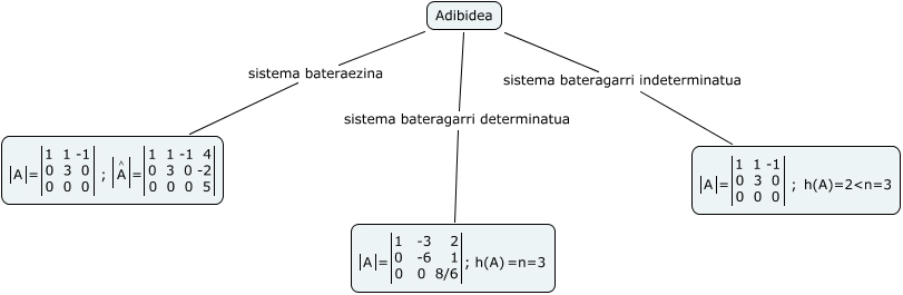 0 0 0 </mtext> </mfenced> <mtext> ; </mtext> <mtext> h(A)=2<n=3 </mtext> </mrow> </math>, Adibidea sistema bateragarri determinatua <math xmlns="http://www.w3.org/1998/Math/MathML"> <mrow> <mfenced open="|" close="|"> <mtext> A </mtext> </mfenced> <mtext> = </mtext> <mfenced open="|" close="|"> <mtext> 1 -3 2