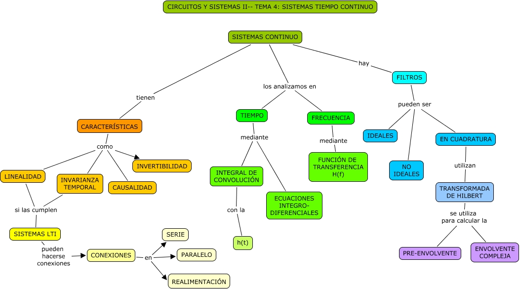 Este Cmap, tiene información relacionada con: Tema 4 Sistemas tiempo discreto, FILTROS pueden ser IDEALES, INVARIANZA TEMPORAL si las cumplen SISTEMAS LTI, CARACTERÍSTICAS como INVARIANZA TEMPORAL, SISTEMAS CONTINUO tienen CARACTERÍSTICAS, SISTEMAS LTI pueden hacerse conexiones CONEXIONES, CONEXIONES en REALIMENTACIÓN, SISTEMAS CONTINUO los analizamos en TIEMPO, EN CUADRATURA utilizan TRANSFORMADA DE HILBERT, INTEGRAL DE CONVOLUCIÓN con la h(t), CONEXIONES en PARALELO, SISTEMAS CONTINUO hay FILTROS, CARACTERÍSTICAS como LINEALIDAD, TIEMPO mediante ECUACIONES INTEGRO- DIFERENCIALES, LINEALIDAD si las cumplen SISTEMAS LTI, CONEXIONES en SERIE, CARACTERÍSTICAS como CAUSALIDAD, TRANSFORMADA DE HILBERT se utiliza para calcular la ENVOLVENTE COMPLEJA, TIEMPO mediante INTEGRAL DE CONVOLUCIÓN, SISTEMAS CONTINUO los analizamos en FRECUENCIA, FILTROS pueden ser NO IDEALES