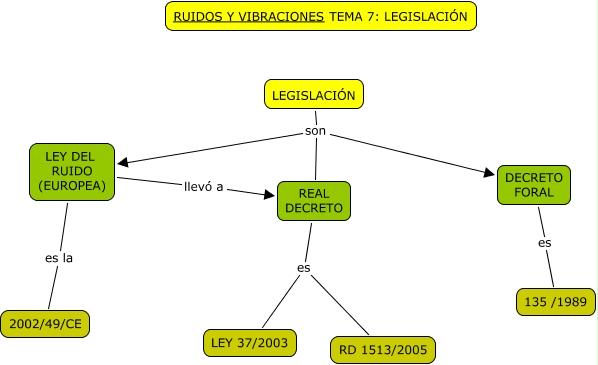 Este Cmap, tiene información relacionada con: Tema 7 Legislación, LEGISLACIÓN son DECRETO FORAL, LEGISLACIÓN son LEY DEL RUIDO (EUROPEA), LEY DEL RUIDO (EUROPEA) llevó a REAL DECRETO, LEY DEL RUIDO (EUROPEA) es la 2002/49/CE, DECRETO FORAL es 135 /1989, REAL DECRETO es LEY 37/2003, REAL DECRETO es RD 1513/2005, LEGISLACIÓN son REAL DECRETO