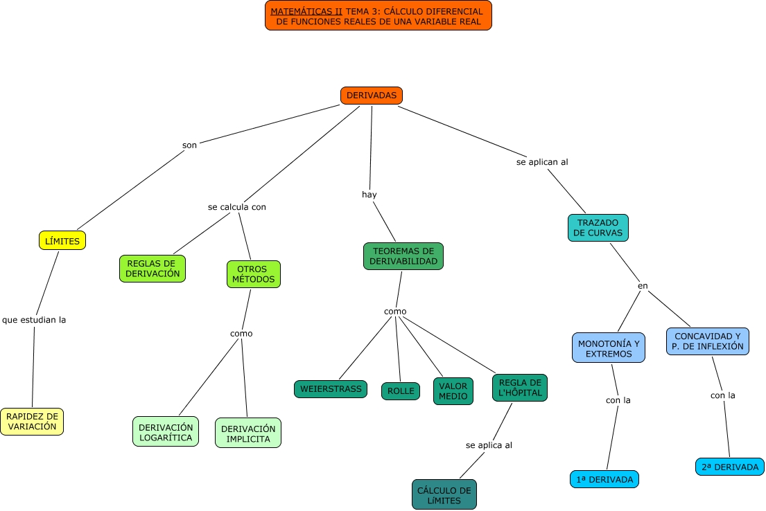 Este Cmap, tiene información relacionada con: Tema 3 Cálculo diferencial, OTROS MÉTODOS como DERIVACIÓN IMPLICITA, OTROS MÉTODOS como DERIVACIÓN LOGARÍTICA, DERIVADAS se calcula con OTROS MÉTODOS, DERIVADAS hay TEOREMAS DE DERIVABILIDAD, TEOREMAS DE DERIVABILIDAD como WEIERSTRASS, DERIVADAS son LÍMITES, TEOREMAS DE DERIVABILIDAD como ROLLE, TEOREMAS DE DERIVABILIDAD como VALOR MEDIO, LÍMITES que estudian la RAPIDEZ DE VARIACIÓN, TRAZADO DE CURVAS en CONCAVIDAD Y P. DE INFLEXIÓN, DERIVADAS se calcula con REGLAS DE DERIVACIÓN, CONCAVIDAD Y P. DE INFLEXIÓN con la 2ª DERIVADA, TEOREMAS DE DERIVABILIDAD como REGLA DE L'HÔPITAL, MONOTONÍA Y EXTREMOS con la 1ª DERIVADA, TRAZADO DE CURVAS en MONOTONÍA Y EXTREMOS, DERIVADAS se aplican al TRAZADO DE CURVAS, REGLA DE L'HÔPITAL se aplica al CÁLCULO DE LíMITES