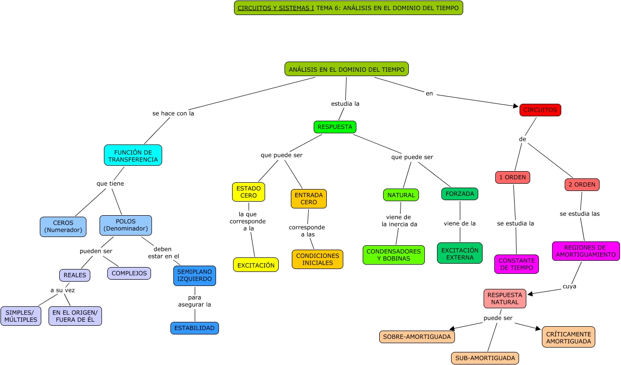 Este Cmap, tiene información relacionada con: Tema 6 Análisis en el dominio del tiempo, RESPUESTA que puede ser ENTRADA CERO, RESPUESTA que puede ser NATURAL, ESTADO CERO la que corresponde a la EXCITACIÓN, RESPUESTA NATURAL puede ser SUB-AMORTIGUADA, ENTRADA CERO corresponde a las CONDICIONES INICIALES, POLOS (Denominador) pueden ser REALES, REGIONES DE AMORTIGUAMIENTO cuya RESPUESTA NATURAL, FUNCIÓN DE TRANSFERENCIA que tiene POLOS (Denominador), RESPUESTA que puede ser ESTADO CERO, POLOS (Denominador) deben estar en el SEMIPLANO IZQUIERDO, REALES a su vez EN EL ORIGEN/ FUERA DE ÉL, RESPUESTA NATURAL puede ser CRÍTICAMENTE AMORTIGUADA, ANÁLISIS EN EL DOMINIO DEL TIEMPO estudia la RESPUESTA, NATURAL viene de la inercia da CONDENSADORES Y BOBINAS, 1 ORDEN se estudia la CONSTANTE DE TIEMPO, RESPUESTA que puede ser FORZADA, ANÁLISIS EN EL DOMINIO DEL TIEMPO en CIRCUITOS, CIRCUITOS de 2 ORDEN, REALES a su vez SIMPLES/ MÚLTIPLES, FUNCIÓN DE TRANSFERENCIA que tiene CEROS (Numerador)