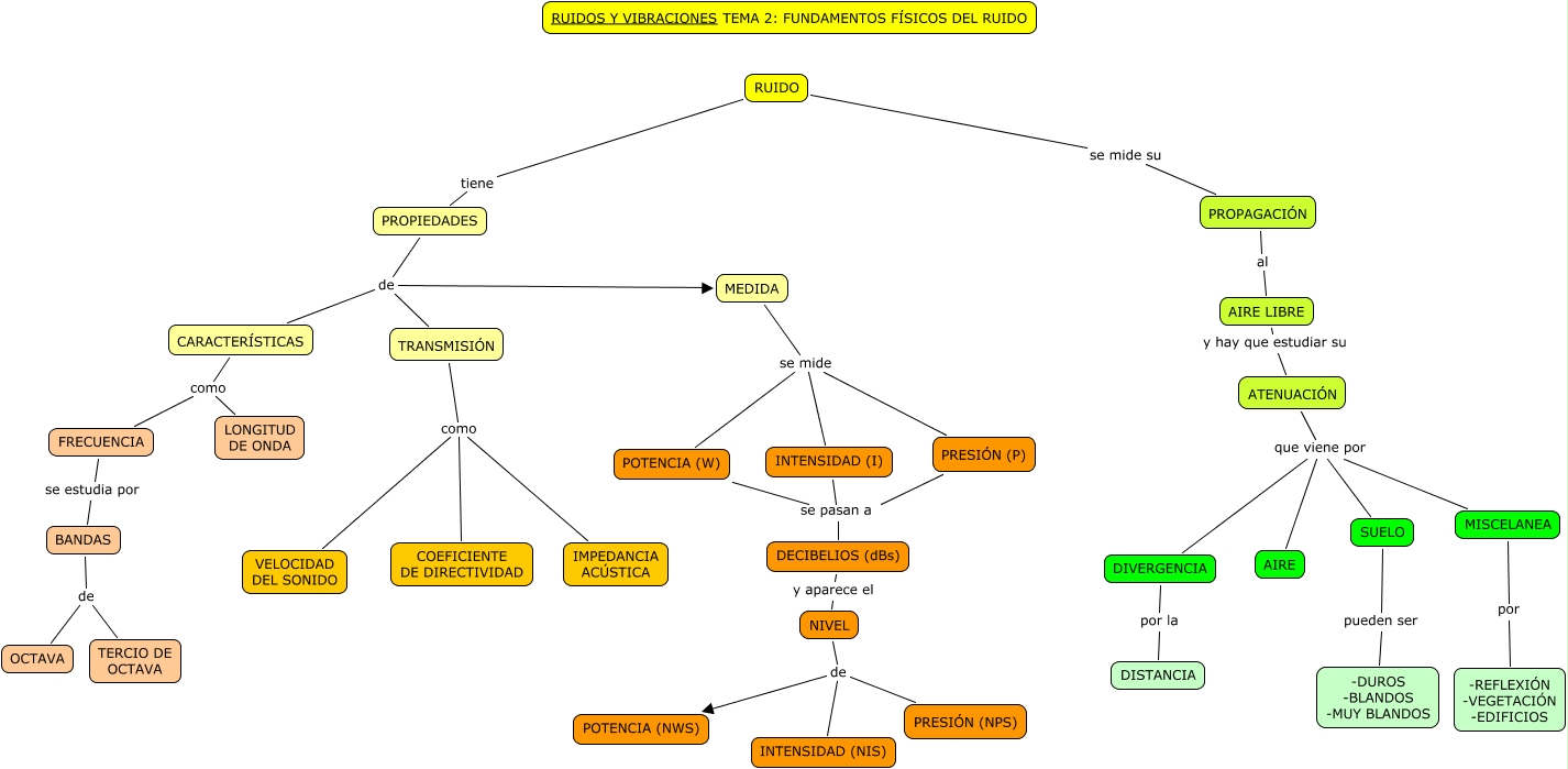 Este Cmap, tiene información relacionada con: Tema 2 Fund físicos del ruido, ATENUACIÓN que viene por SUELO, NIVEL de PRESIÓN (NPS), ATENUACIÓN que viene por MISCELANEA, POTENCIA (W) se pasan a DECIBELIOS (dBs), SUELO pueden ser -DUROS -BLANDOS -MUY BLANDOS, NIVEL de POTENCIA (NWS), TRANSMISIÓN como COEFICIENTE DE DIRECTIVIDAD, RUIDO se mide su PROPAGACIÓN, CARACTERÍSTICAS como LONGITUD DE ONDA, PRESIÓN (P) se pasan a DECIBELIOS (dBs), PROPIEDADES de MEDIDA, MEDIDA se mide POTENCIA (W), BANDAS de OCTAVA, FRECUENCIA se estudia por BANDAS, ATENUACIÓN que viene por AIRE, DECIBELIOS (dBs) y aparece el NIVEL, PROPAGACIÓN al AIRE LIBRE, PROPIEDADES de TRANSMISIÓN, NIVEL de INTENSIDAD (NIS), AIRE LIBRE y hay que estudiar su ATENUACIÓN