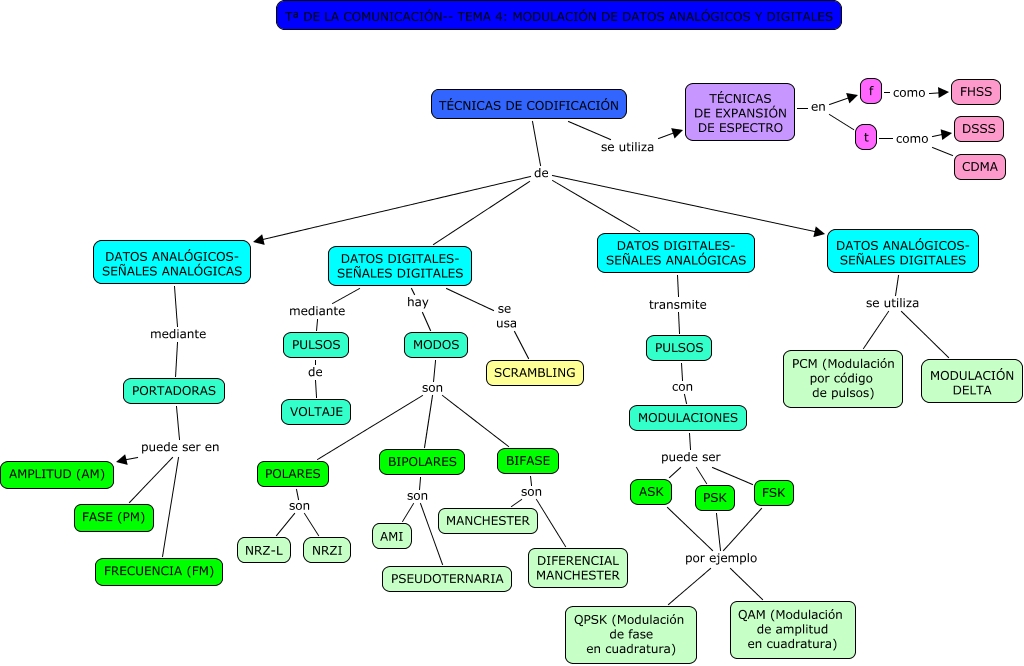 Este Cmap, tiene información relacionada con: Tema 4 Modulaciones, PORTADORAS puede ser en FRECUENCIA (FM), TÉCNICAS DE CODIFICACIÓN se utiliza TÉCNICAS DE EXPANSIÓN DE ESPECTRO, t como DSSS, BIPOLARES son PSEUDOTERNARIA, TÉCNICAS DE CODIFICACIÓN de DATOS DIGITALES- SEÑALES DIGITALES, t como CDMA, f como FHSS, DATOS ANALÓGICOS- SEÑALES DIGITALES se utiliza PCM (Modulación por código de pulsos), BIFASE son MANCHESTER, POLARES son NRZ-L, MODOS son BIFASE, TÉCNICAS DE EXPANSIÓN DE ESPECTRO en f, MODULACIONES puede ser PSK, FSK por ejemplo QAM (Modulación de amplitud en cuadratura), DATOS ANALÓGICOS- SEÑALES DIGITALES se utiliza MODULACIÓN DELTA, DATOS DIGITALES- SEÑALES ANALÓGICAS transmite PULSOS, TÉCNICAS DE CODIFICACIÓN de DATOS ANALÓGICOS- SEÑALES DIGITALES, MODOS son BIPOLARES, MODULACIONES puede ser ASK, DATOS DIGITALES- SEÑALES DIGITALES se usa SCRAMBLING