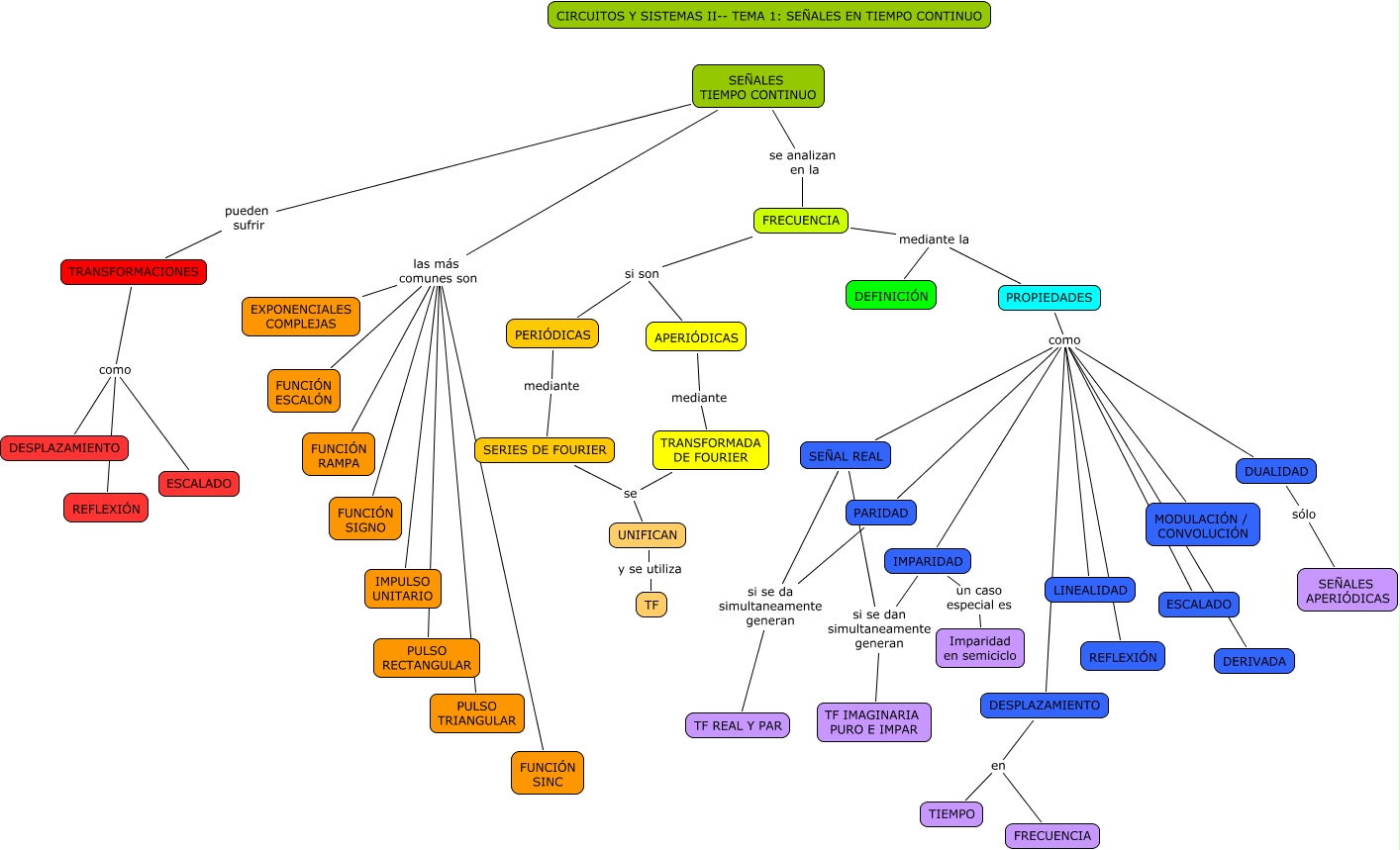 Este Cmap, tiene información relacionada con: Tema 1 Señales en tiempo continuo, PROPIEDADES como LINEALIDAD, PROPIEDADES como MODULACIÓN / CONVOLUCIÓN, PROPIEDADES como REFLEXIÓN, PROPIEDADES como DERIVADA, DESPLAZAMIENTO en FRECUENCIA, IMPARIDAD un caso especial es Imparidad en semiciclo, SEÑALES TIEMPO CONTINUO las más comunes son PULSO RECTANGULAR, FRECUENCIA si son APERIÓDICAS, DUALIDAD sólo SEÑALES APERIÓDICAS, SEÑALES TIEMPO CONTINUO las más comunes son FUNCIÓN SIGNO, TRANSFORMACIONES como DESPLAZAMIENTO, SEÑAL REAL si se da simultaneamente generan TF REAL Y PAR, PROPIEDADES como ESCALADO, APERIÓDICAS mediante TRANSFORMADA DE FOURIER, SEÑALES TIEMPO CONTINUO las más comunes son IMPULSO UNITARIO, SERIES DE FOURIER se UNIFICAN, SEÑALES TIEMPO CONTINUO las más comunes son FUNCIÓN SINC, SEÑALES TIEMPO CONTINUO pueden sufrir TRANSFORMACIONES, PROPIEDADES como PARIDAD, PROPIEDADES como DUALIDAD