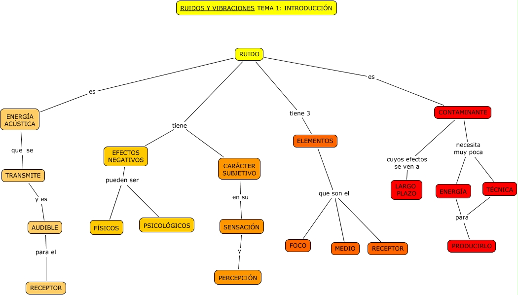 Este Cmap, tiene información relacionada con: Tema 1 Introducción (Ruido), RUIDO es ENERGÍA ACÚSTICA, ENERGÍA ACÚSTICA que se TRANSMITE, ELEMENTOS que son el MEDIO, RUIDO tiene EFECTOS NEGATIVOS, EFECTOS NEGATIVOS pueden ser FÍSICOS, CONTAMINANTE cuyos efectos se ven a LARGO PLAZO, CONTAMINANTE necesita muy poca ENERGÍA, CARÁCTER SUBJETIVO en su SENSACIÓN, RUIDO tiene 3 ELEMENTOS, RUIDO es CONTAMINANTE, RUIDO tiene CARÁCTER SUBJETIVO, CONTAMINANTE necesita muy poca TÉCNICA, SENSACIÓN y PERCEPCIÓN, AUDIBLE para el RECEPTOR, TÉCNICA para PRODUCIRLO, TRANSMITE y es AUDIBLE, ENERGÍA para PRODUCIRLO, ELEMENTOS que son el FOCO, ELEMENTOS que son el RECEPTOR, EFECTOS NEGATIVOS pueden ser PSICOLÓGICOS