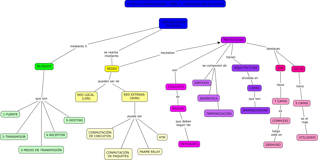 Este Cmap, tiene información relacionada con: Tema 2 Comunicación de datos, ITC-IP tiene 5 CAPAS, RED EXTENSA (WAN) puede ser ATM, REGLAS que deben seguir las ENTIDADES, 5 CAPAS es el más UTILIZADO, PROTOCOLOS destacan ITC-IP, BLOQUES que son 4-RECEPTOR, BLOQUES que son 2-TRANSMISOR, BLOQUES que son 5-DESTINO, REDES necesitan PROTOCOLOS, PROTOCOLOS se componen de SINTAXIS, REDES pueden ser de RED LOCAL (LAN), PROTOCOLOS son CONJUNTO, RED EXTENSA (WAN) puede ser CONMUTACIÓN DE PAQUETES, COMPLEJO luego está en DESHUSO, PROTOCOLOS se componen de TEMPORIZACIÓN, COMUNICACIÓN DE DATOS mediante 5 BLOQUES, REDES pueden ser de RED EXTENSA (WAN), RED EXTENSA (WAN) puede ser CONMUTACIÓN DE CIRCUITOS, COMUNICACIÓN DE DATOS se realiza mediante REDES, 7 CAPAS es COMPLEJO