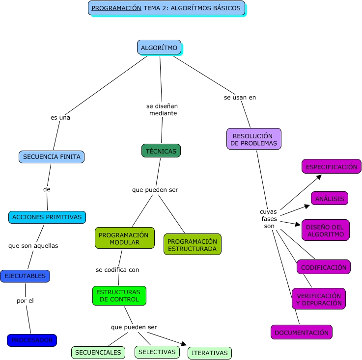 Este Cmap, tiene información relacionada con: Tema 2 Algoritimia básica, TÉCNICAS que pueden ser PROGRAMACIÓN ESTRUCTURADA, RESOLUCIÓN DE PROBLEMAS cuyas fases son CODIFICACIÓN, RESOLUCIÓN DE PROBLEMAS cuyas fases son ANÁLISIS, ALGORÍTMO se diseñan mediante TÉCNICAS, ACCIONES PRIMITIVAS que son aquellas EJECUTABLES, RESOLUCIÓN DE PROBLEMAS cuyas fases son DOCUMENTACIÓN, ESTRUCTURAS DE CONTROL que pueden ser SECUENCIALES, ALGORÍTMO se usan en RESOLUCIÓN DE PROBLEMAS, ALGORÍTMO es una SECUENCIA FINITA, PROGRAMACIÓN MODULAR se codifica con ESTRUCTURAS DE CONTROL, SECUENCIA FINITA de ACCIONES PRIMITIVAS, RESOLUCIÓN DE PROBLEMAS cuyas fases son VERIFICACIÓN Y DEPURACIÓN, RESOLUCIÓN DE PROBLEMAS cuyas fases son ESPECIFICACIÓN, ESTRUCTURAS DE CONTROL que pueden ser ITERATIVAS, RESOLUCIÓN DE PROBLEMAS cuyas fases son DISEÑO DEL ALGORITMO, EJECUTABLES por el PROCESADOR, ESTRUCTURAS DE CONTROL que pueden ser SELECTIVAS, TÉCNICAS que pueden ser PROGRAMACIÓN MODULAR
