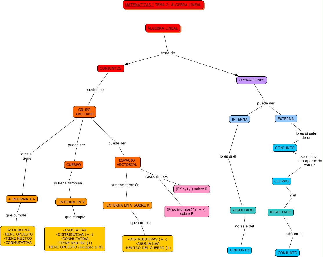 Este Cmap, tiene información relacionada con: Tema 2.1 Conjuntos y operaciones, RESULTADO está en el CONJUNTO, GRUPO ABELIANO puede ser CUERPO, ESPACIO VECTORIAL si tiene también ·EXTERNA EN V SOBRE K, ·INTERNA EN V que cumple -ASOCIATIVA -DISTRIBUTIVA (+,·) -CONMUTATIVA -TIENE NEUTRO (1) -TIENE OPUESTO (excepto el 0), ÁLGEBRA LINEAL trata de CONJUNTOS, ESPACIO VECTORIAL casos de e.v. (R^n,+,·) sobre R, CUERPO y el RESULTADO, GRUPO ABELIANO lo es si tiene + INTERNA A V, OPERACIONES puede ser INTERNA, ÁLGEBRA LINEAL trata de OPERACIONES, + INTERNA A V que cumple -ASOCIATIVA -TIENE OPUESTO -TIENE NUETRO -CONMUTATIVA, ESPACIO VECTORIAL casos de e.v. (P(polinomios)^n,+,·) sobre R, INTERNA lo es si el RESULTADO, OPERACIONES puede ser EXTERNA, CONJUNTO se realiza la a operación con un CUERPO, RESULTADO no sale del CONJUNTO, EXTERNA lo es si sale de un CONJUNTO, CUERPO si tiene también ·INTERNA EN V, CONJUNTOS pueden ser GRUPO ABELIANO, GRUPO ABELIANO puede ser ESPACIO VECTORIAL