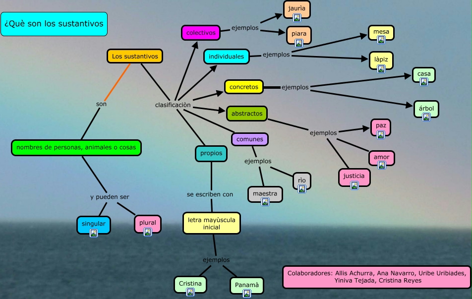 los sustantivos, abstractos ejemplos justicia, Los sustantivos clasificaciòn concretos, colectivos ejemplos piara, Los sustantivos son nombres de personas, animales o cosas, nombres de personas, animales o cosas y pueden ser plural, concretos ejemplos árbol, comunes ejemplos maestra, colectivos ejemplos jaurìa, abstractos ejemplos paz, Los sustantivos clasificaciòn individuales