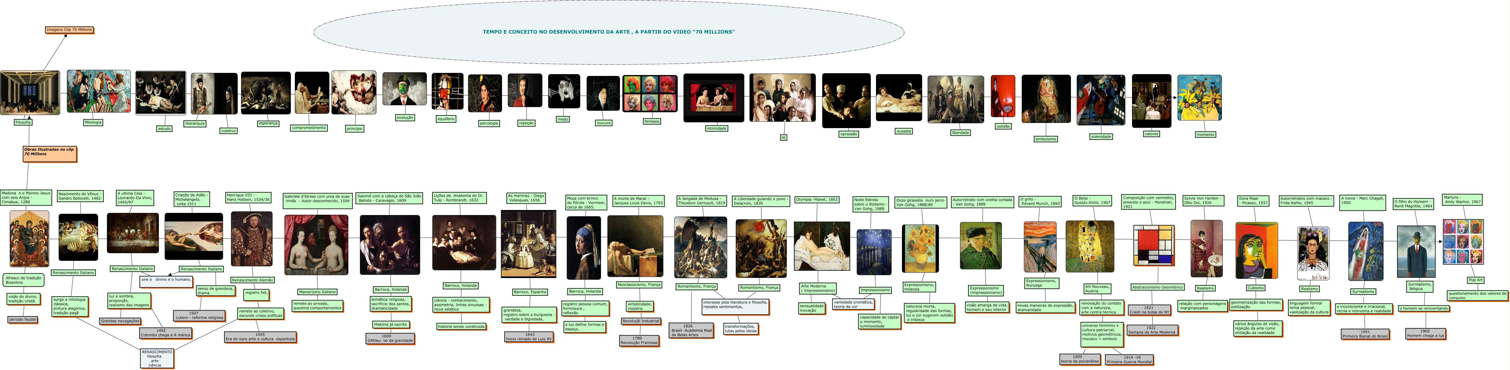 Esse mapa conceitual, produzido no IHMC CmapTools, tem a informação relacionada a: Tempo e Conceito no desenvolvimento da Arte, a partir do video 70 millions, luz e sombra, proporção, realismo das imagens ???? 1492 Colombo chega a A mérica, Lições de Anatomia do Dr. Tulp - Rembrandt, 1632 ????, universo feminino x cultura patriarcal, motivos geométricos, mocaico = simbolo ???? 1914 -18 Primeira Guerra Mundial, visão do divino, tradição cristã ???? periodo feudal, ???? Barroca, Holanda, ???? liberdade, Noite Estrela sobre o Ródamo - Van Gohg, 1888 ????, Renascimento Italiano ???? une o divino e o humano,, ???? fé, Barroco, Espanha ???? grandeza, registro sobre a burguesia - verdade e dignidade,, registro pessoa comum, formosura , reflexão ???? a luz define formas e espaço,, Renascimento Italiano ????, Renascimento Italiano ???? surge a mitologia clássica, pintura alegórica, tradição pagã, Afresco de tradição Bizantina ???? visão do divino, tradição cristã, ???? psicologia, ???? simbolismo, Romantismo, França ???? interesse pela literatura e filosofia, ressalta sentimentos,, interesse pela literatura e filosofia, ressalta sentimentos, ???? transformações, lutas pelos ideias, Barroco, Holanda ???? ciência - conhecimento, assimetria, linhas sinuosas - nova estética, Composição com vermelho, amarelo e azul - Mondrian, 1921 ???? Abstracionismo Geométrico