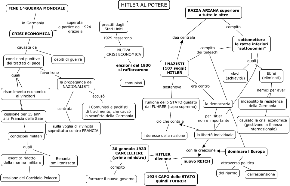 Questa Cmap, creata con IHMC CmapTools, contiene informazioni relative a: 2^_GM_Hitler al potere, condizioni punitive dei trattati di pace quali condizioni militari, CRISI ECONOMICA causata da condizioni punitive dei trattati di pace, la libertà individuale ciò che conta è interesse della nazione, dominare l'Europa attraverso politica del riarmo, nuovo REICH HITLER divenne 30 gennaio 1933 CANCELLIERE (primo ministro), l'unione dello STATO guidato dal FUHRER (capo supremo) ciò che conta è interesse della nazione, i NAZISTI (107 seggi) HITLER compito dei tedeschi sottomettere le razze inferiori "sottouomini", condizioni militari quali Renania smilitarizzata, CRISI ECONOMICA superata a partire dal 1924 grazie a prestiti dagli Stati Uniti, la propaganda dei NAZIONALISTI accusò i Comunisti e pacifisti di tradimento, che causò la sconfitta della Germania, i NAZISTI (107 seggi) HITLER idea centrale RAZZA ARIANA superiore a tutte le altre, la propaganda dei NAZIONALISTI centrata sulla voglia di rivincita soprattutto contro FRANCIA, i NAZISTI (107 seggi) HITLER compito dei tedeschi dominare l'Europa, dominare l'Europa attraverso politica dell'espansione, dominare l'Europa con la creazione nuovo REICH, Ebrei (eliminati) nemici per aver indebolito la resistenza della Germania, 30 gennaio 1933 CANCELLIERE (primo ministro) compito formare il nuovo governo, la democrazia per Hitler non è importante la libertà individuale, RAZZA ARIANA superiore a tutte le altre compito sottomettere le razze inferiori "sottouomini", condizioni militari quali cessione del Corridoio Polacco