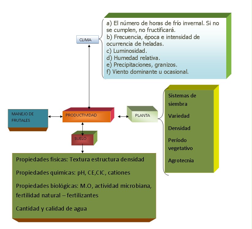 Este Cmap, tiene información relacionada con: FACTORES DE LA PRODUCCION, Requisitos de clima El clima representa el primer factor a considerar. Debido a que es muy poco manejable, su consideración debe ser un requisito indispensable en el momento de decidir el establecimiento de cualquier frutal, tanto para hoja caduca como un frutal de hoja perenne. Cada especie, e incluso cada variedad dentro de la especie, presentan requisitos propios del clima, a veces muy distintos que los de otras. Por lo tanto, es fundamental conocer exactamente los requisitos de la especie y variedad a plantar y, desde luego, verificar si las condiciones climáticas reinantes en el predio son acordes con estos requisitos. FACTOR LUZ. Al favorecer la fotosíntesis aumenta la producción de la planta. La calidad de la fruta depende en gran parte de la luz; cuanta más luz, mejor sabor, color y conservación, pues ésta está ligada a la cantidad de hidratos de carbono que quede en la fruta., SUELO. El hecho de constituir una elevada inversión y a largo plazo, obliga ubicar las plantaciones en el mejor terreno posible. sobre cuáles son los frutales que mejor se adaptan a las características climatológicas y topográficas de la región. El clima debe ser óptimo para la especie y variedad a plantar pues resulta inútil ir contra él y tratar de doblegar a la naturaleza. Por otro lado, el ahorro al momento de adquirir el terreno generalmente se paga después, ya que en un suelo con limitaciones la producción siempre será menor y el costo de producción mayor. Esto pone de manifiesto la conveniencia de recurrir a un buen asesoramiento para la adquisición o selección del terreno. REQUISITOS CANTIDAD Y CALIDAD DEL AGUA, Requisitos de clima El clima representa el primer factor a considerar. Debido a que es muy poco manejable, su consideración debe ser un requisito indispensable en el momento de decidir el establecimiento de cualquier frutal, tanto para hoja caduca como un frutal de hoja perenne. Cada especie, e incluso cada variedad dentro de la especie, presentan requisitos propios del clima, a veces muy distintos que los de otras. Por lo tanto, es fundamental conocer exactamente los requisitos de la especie y variedad a plantar y, desde luego, verificar si las condiciones climáticas reinantes en el predio son acordes con estos requisitos. FACTOR CALOR. Todas las funciones que determinan la actividad de la planta, tales como: asimilación del carbono, actividad de las diastasas, brotación, función radicular, floración, fecundación de las flores, maduración de la fruta y nitrificación, tienen sus temperaturas mínimas y máximas, fuera de las cuales se suspende dicha actividad, existiendo una temperatura óptima en la cual la función llega a su máximo., QUIMICAS TENEMOS CE, SUELO. El hecho de constituir una elevada inversión y a largo plazo, obliga ubicar las plantaciones en el mejor terreno posible. sobre cuáles son los frutales que mejor se adaptan a las características climatológicas y topográficas de la región. El clima debe ser óptimo para la especie y variedad a plantar pues resulta inútil ir contra él y tratar de doblegar a la naturaleza. Por otro lado, el ahorro al momento de adquirir el terreno generalmente se paga después, ya que en un suelo con limitaciones la producción siempre será menor y el costo de producción mayor. Esto pone de manifiesto la conveniencia de recurrir a un buen asesoramiento para la adquisición o selección del terreno. REQUISITOS El suelo más adecuado para la plantación de árboles frutales debe ser relativamente plano, profundo, de textura franca y sin impedimentos que dificulten el libre paso de las raíces y la precolación del agua. Respecto del drenaje, no se debe plantar frutales en suelos con mal drenaje. Si éste es el caso, debe ser mejorado antes de la plantación mediante el establecimiento de un adecuado sistema de drenes. El problema del mal drenaje se manifiesta, por la muerte de las raíces a partir de la profundidad de suelo en donde comienza la saturación con el agua. El mal drenaje también puede determinar una salinización del suelo, especialmente en zonas áridas o semiáridas. Esto debido a que las sales incorporadas al suelo a través de los riego, no pueden ser lixiviadas en profundidad y se van acumulando en la parte superior del suelo por capilaridad, BIOLOGICAS TENEMOS ACVTIVIDAD MICROBIANA, FACTORES DE LA PRODUCCUCIÓN TENEMOS Requisitos de clima El clima representa el primer factor a considerar. Debido a que es muy poco manejable, su consideración debe ser un requisito indispensable en el momento de decidir el establecimiento de cualquier frutal, tanto para hoja caduca como un frutal de hoja perenne. Cada especie, e incluso cada variedad dentro de la especie, presentan requisitos propios del clima, a veces muy distintos que los de otras. Por lo tanto, es fundamental conocer exactamente los requisitos de la especie y variedad a plantar y, desde luego, verificar si las condiciones climáticas reinantes en el predio son acordes con estos requisitos., QUIMICAS TENEMOS CIC, FACTORES DE LA PRODUCCUCIÓN TENEMOS FACTORES ECOLOGICOS, Requisitos de clima El clima representa el primer factor a considerar. Debido a que es muy poco manejable, su consideración debe ser un requisito indispensable en el momento de decidir el establecimiento de cualquier frutal, tanto para hoja caduca como un frutal de hoja perenne. Cada especie, e incluso cada variedad dentro de la especie, presentan requisitos propios del clima, a veces muy distintos que los de otras. Por lo tanto, es fundamental conocer exactamente los requisitos de la especie y variedad a plantar y, desde luego, verificar si las condiciones climáticas reinantes en el predio son acordes con estos requisitos. FACTOR VIENTO. La circulación del aire es sumamente beneficiosa y la utilidad de los vientos depende de diversas características, tales como velocidad, temperatura, grado higrom